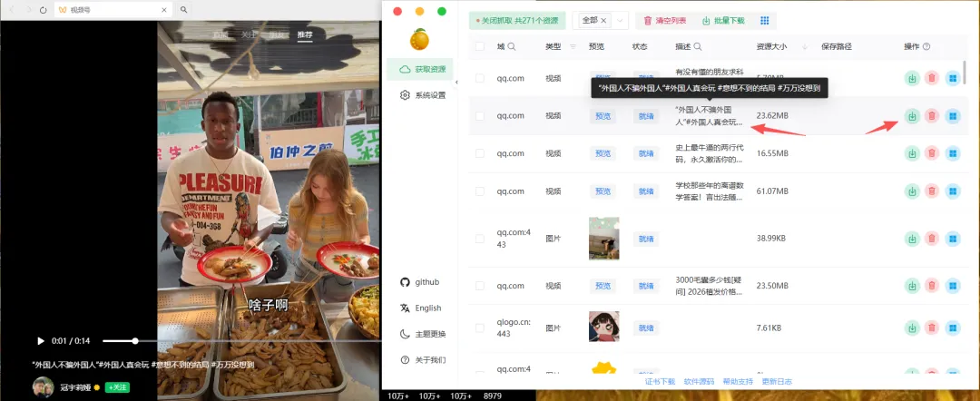 然后回到软件主界面,点击左上方直接开启抓取功能,接着去电脑端打开你想下载的视频号进行播放,它就会自动把资源给你嗅探出来了。