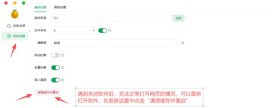 你进去之后软件之后,点击左边的系统设置,基础设置里先去把下载的保存目录给设置好,不然等下下载完了找不到文件。