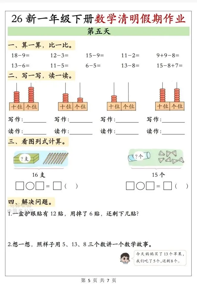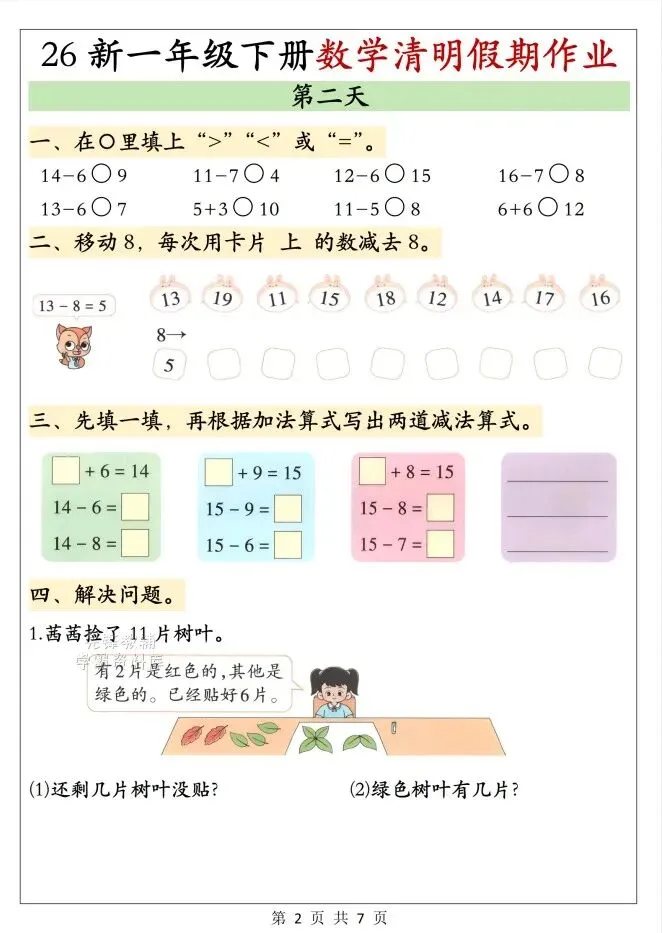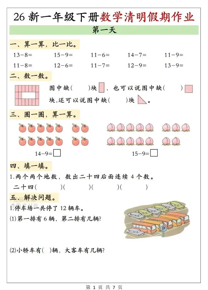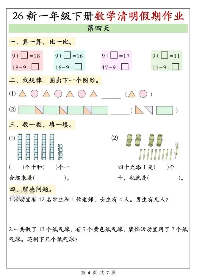 文末免费下载|26新一年级下册数学清明节假期作业(附答案)