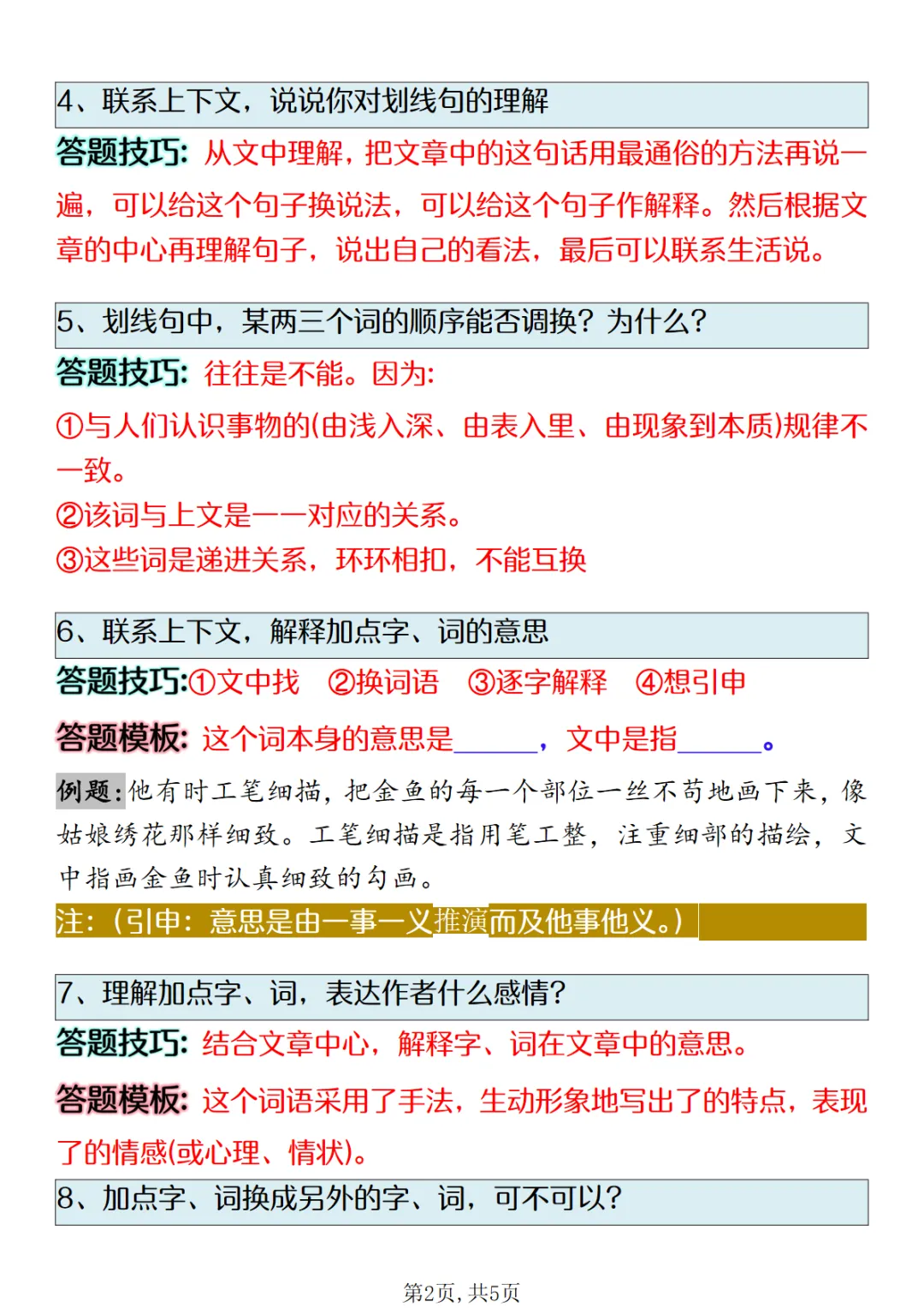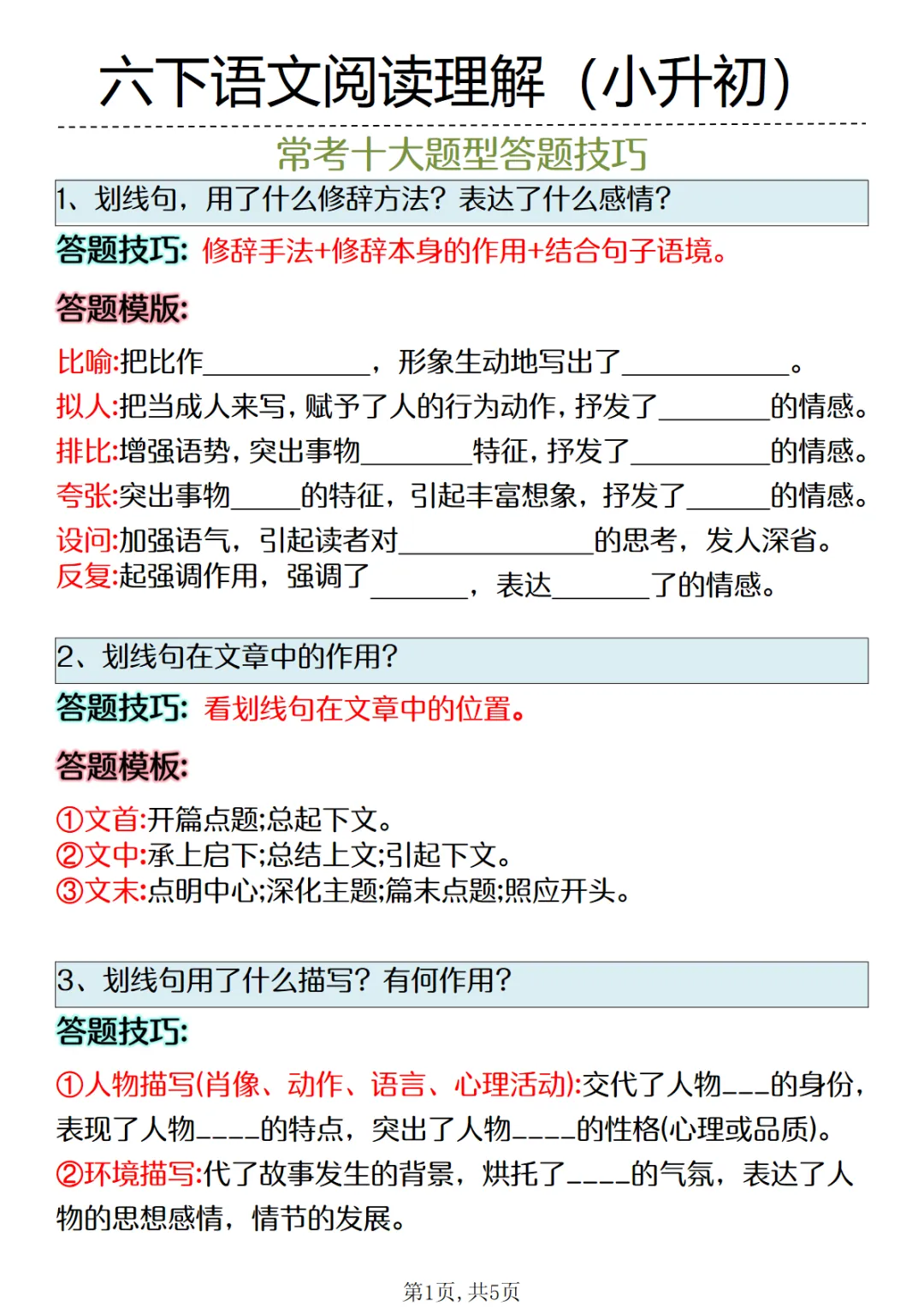 六年级(下)语文 阅读理解答题技巧(小升初)