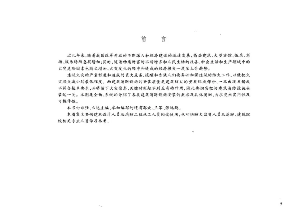 建筑火灾的严重程度和造成的巨大危害,提醒和告诫人们要务必加强建筑的防火工作,以便把火灾损失减小到最低程度。而廷筑消防设施的安装质量是建筑防火的重要组成部分,一旦出现差错或不符合技术要求,必将留下火灾隐患,关键时刻起不到应有的作用,因此要切实把好建筑消防设施安装这一关。本图集全面、系统的介绍了各类建筑消防设施安装的要求及具体图例,力求突出实用性及可操作性。