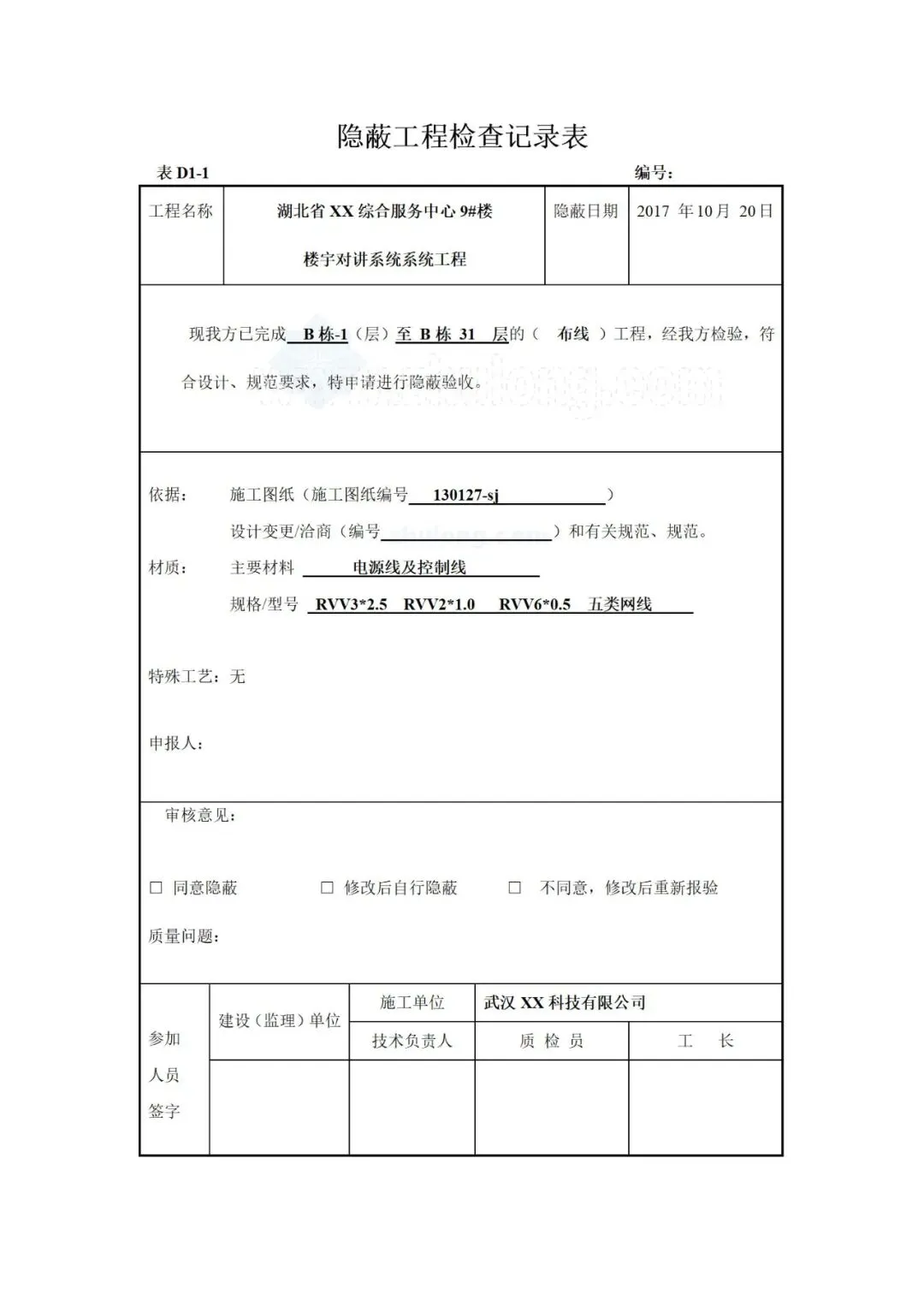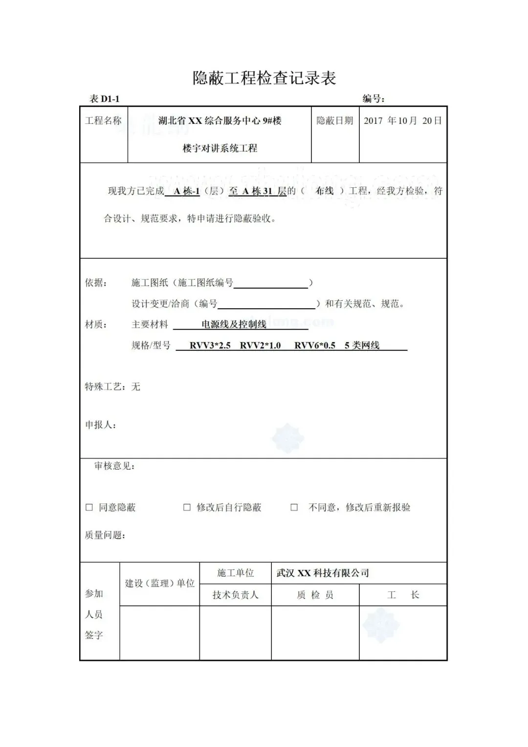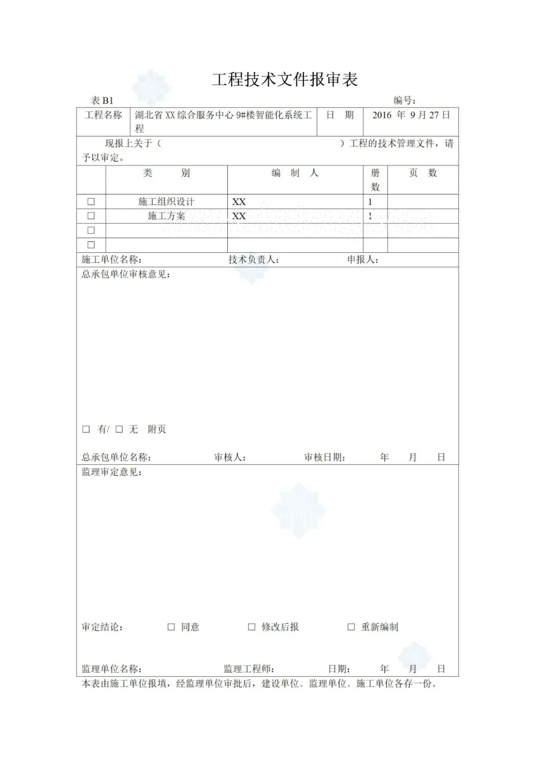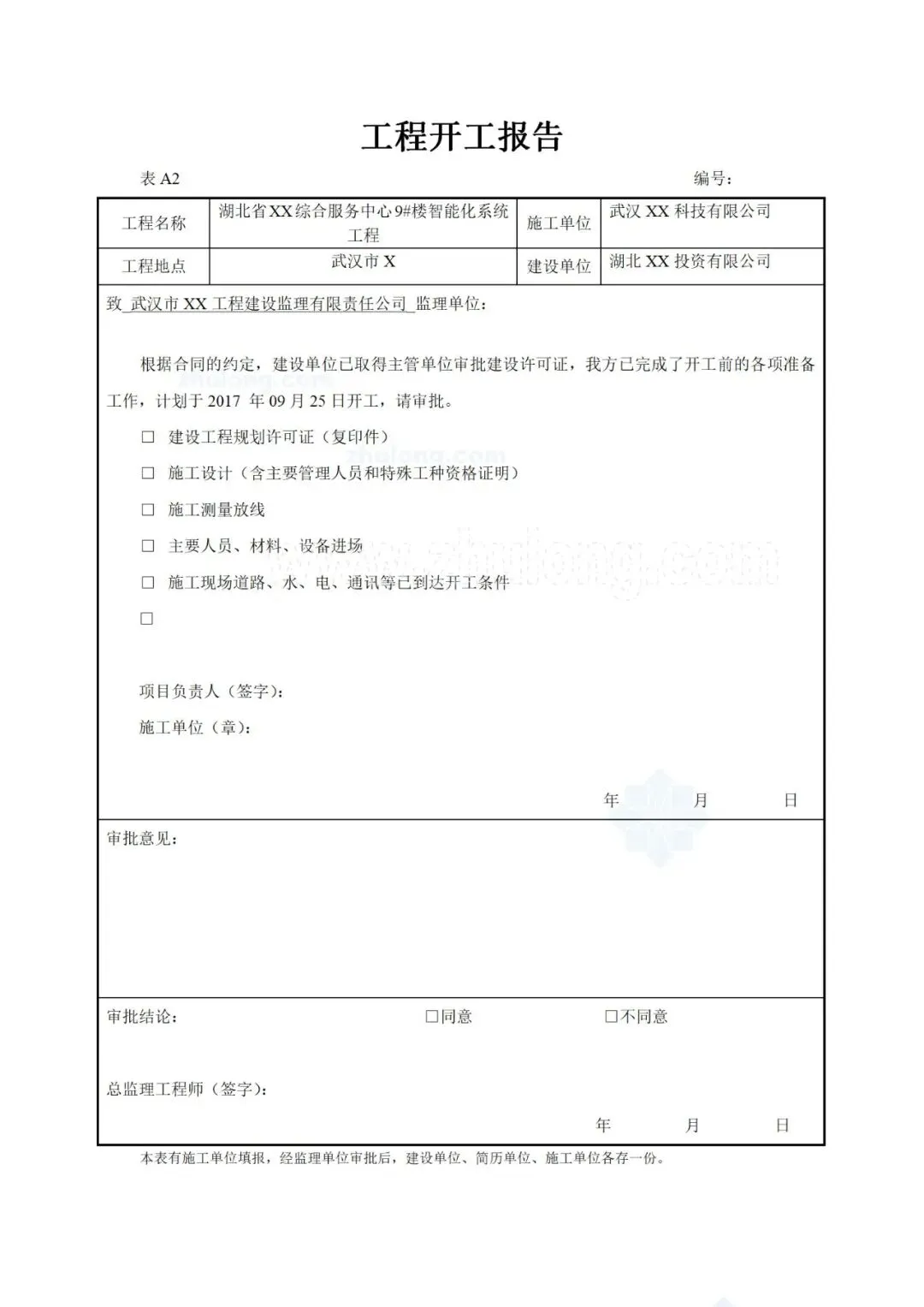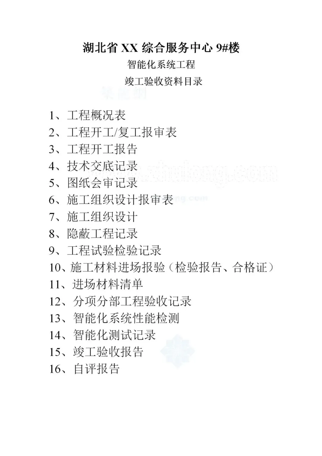 1、工程概况表 2、工程开工/复工报审表 3、工程开工报告 4、技术交底记录 5、图纸会审记录 6、施工组织设计报审表 7、施工组织设计 8、隐蔽工程记录 9、工程试验检验记录 10、施工材料进场报验(检验报告、合格证) 11、进场材料清单 12、分项分部工程验收记录 13、智能化系统性能检测 14、智能化测试记录 15、竣工验收报告 16、自评报告 |
