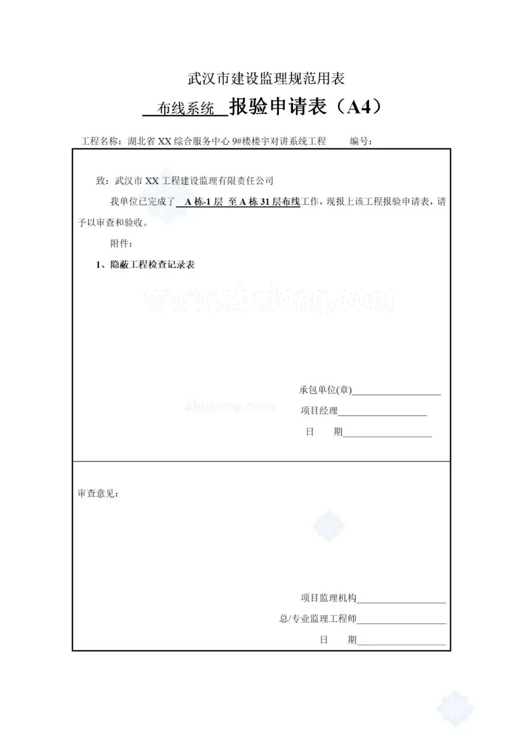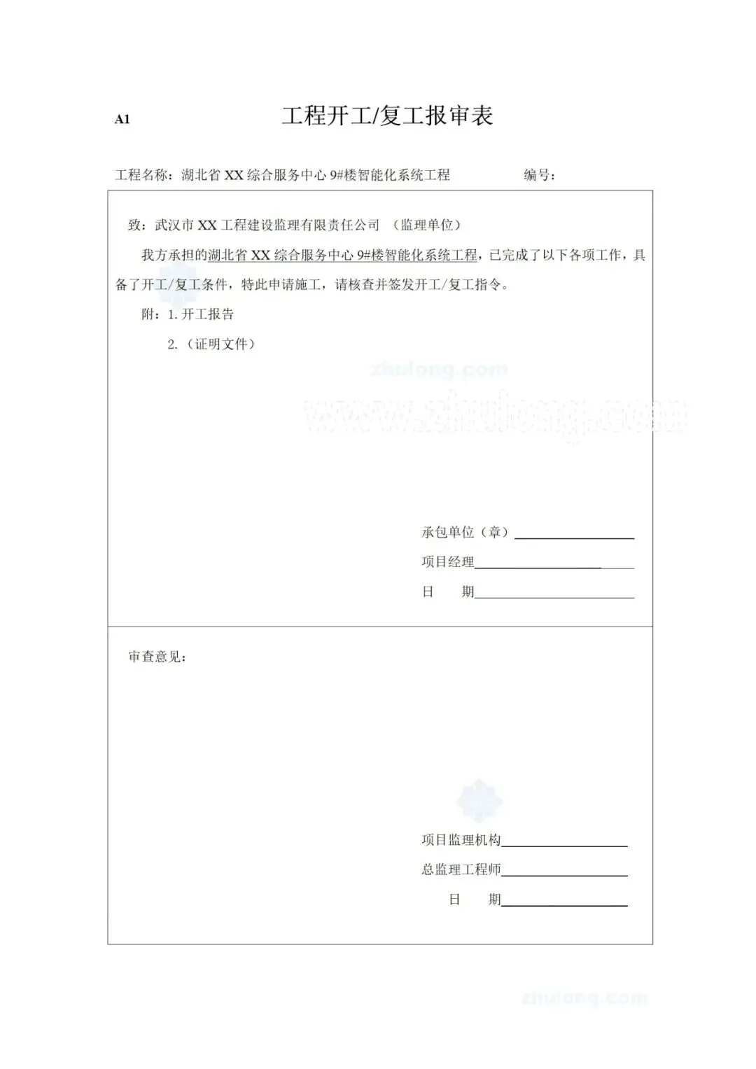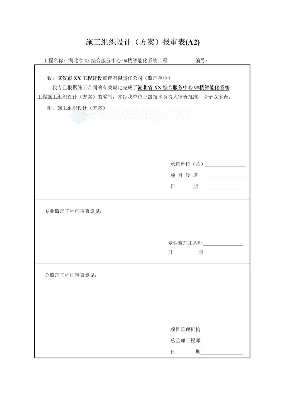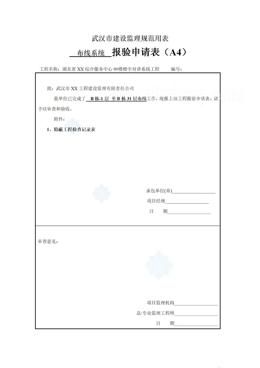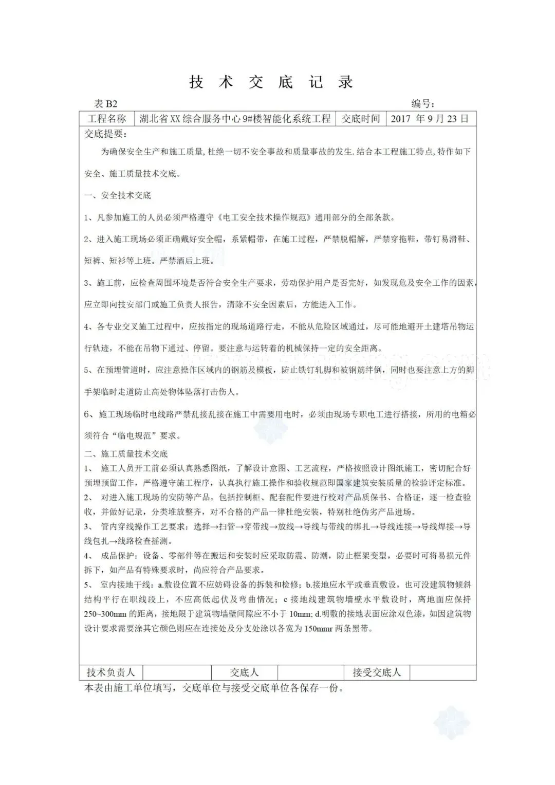 1、工程概况表 2、工程开工/复工报审表 3、工程开工报告 4、技术交底记录 5、图纸会审记录 6、施工组织设计报审表 7、施工组织设计 8、隐蔽工程记录 9、工程试验检验记录 10、施工材料进场报验(检验报告、合格证) 11、进场材料清单 12、分项分部工程验收记录 13、智能化系统性能检测 14、智能化测试记录 15、竣工验收报告 16、自评报告 |