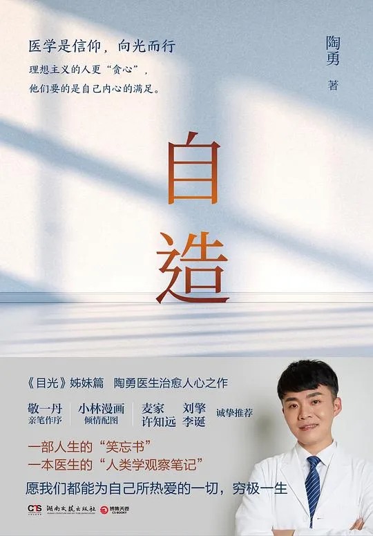 如果说《目光》的出版是一个偶然,那么《自造》的问世则更像一个必然。关于事业、关于理想、关于爱情、关于亲情、关于人生……在这本书中,陶勇不仅是一位公立医院的眼科医生,更是患者朋友的人生医师。他以医者和普通人的双重视角,忠实地记录了这个时代的医患关系、医者思考和医学故事,分享医院之内和医院之外的人生感悟。 作为一个医生,陶勇自然地想要给求助者以解决方法。他说:“近两年来,我遇到的是自己人生中突如其来的打击,接触到的是年轻人普遍存在的迷茫,前者给我带来的只是短暂的调整,而后者却让我长时间陷入思考。”这本书是一个罕见的理想主义者的人生独白,他深知自己的方法未必适合每一个人,但他仍然愿意诚恳地分享,他让你相信这世上有光,让你相信光的力量。