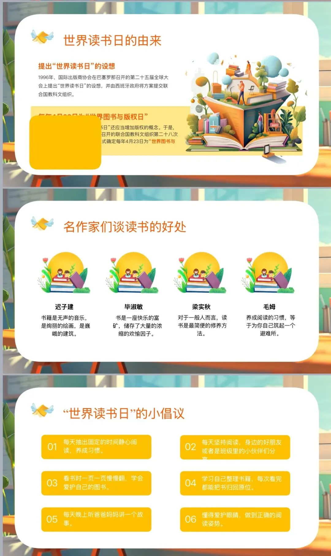 今天,我们一起了解了世界读书日,听了大作家们谈读书,学习了怎么爱护书,还知道了好多有趣的读书活动。