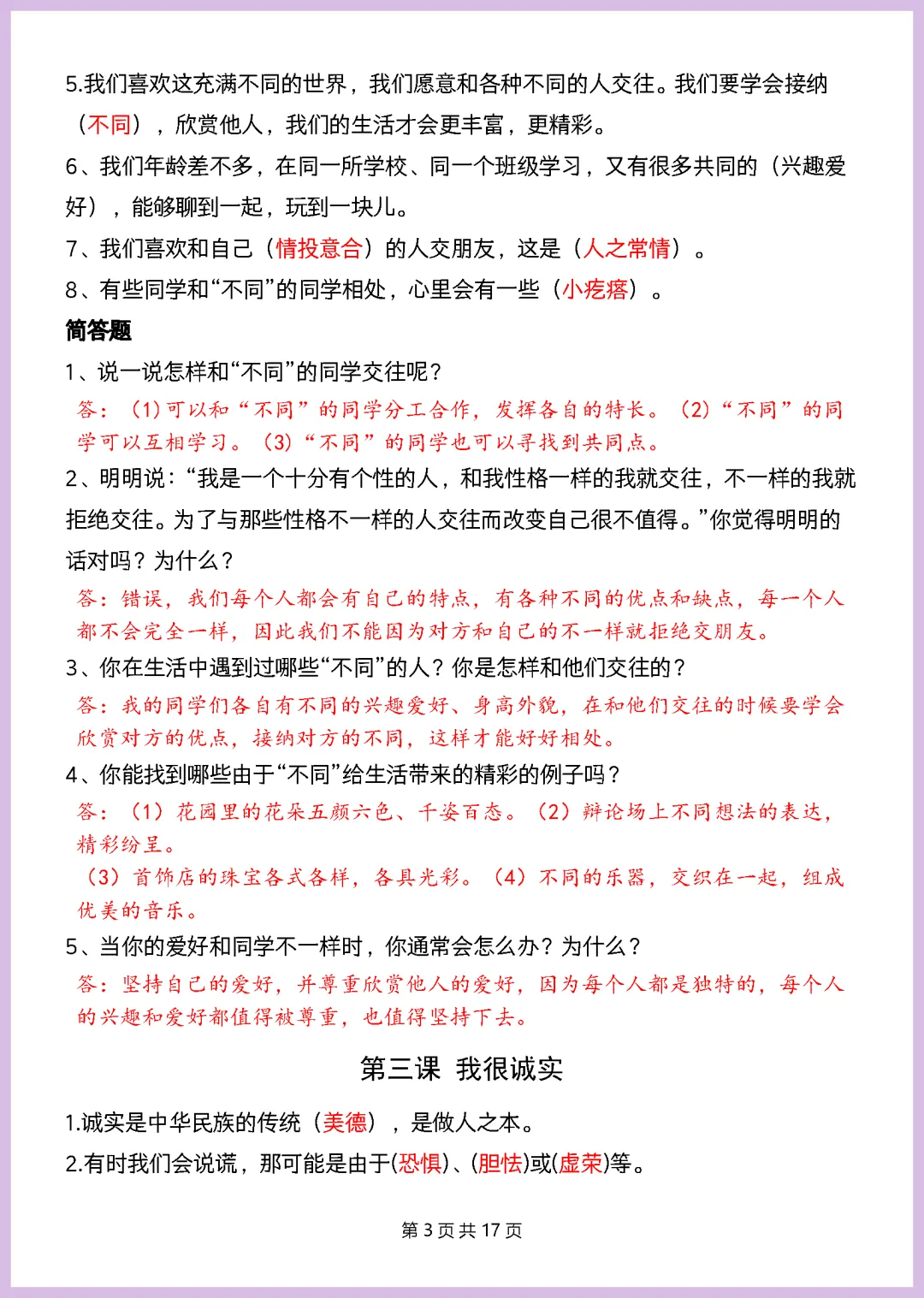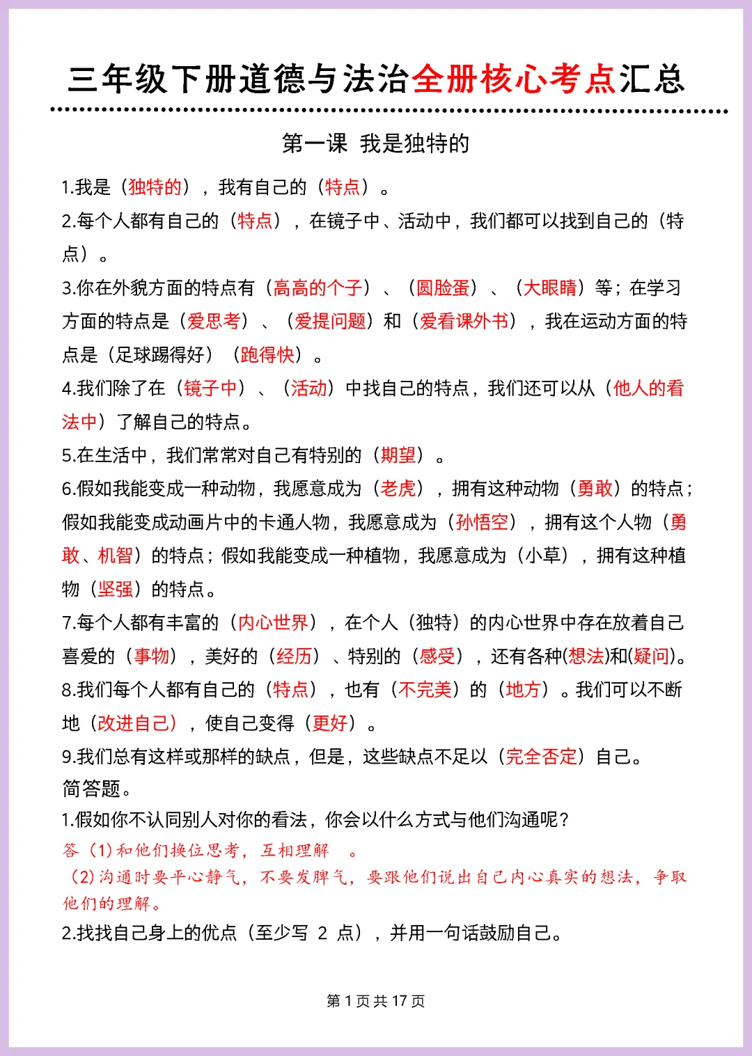 各位家长注意啦!2024 年最新版三年级下册《道德与法治重点知识点汇总》来啦,全套共 17 页精华内容。这份资料紧扣教材,将全书核心考点、必背概念梳理得清清楚楚,帮助孩子快速构建知识框架,轻松攻克记忆难点,复习效率翻倍!无论是日常巩固还是考前冲刺,都是不可或缺的提分神器。别再让孩子盲目翻书了,需要的家长赶紧收藏并打印出来,让孩子趁着好时机练一练,扎实基础拿高分!