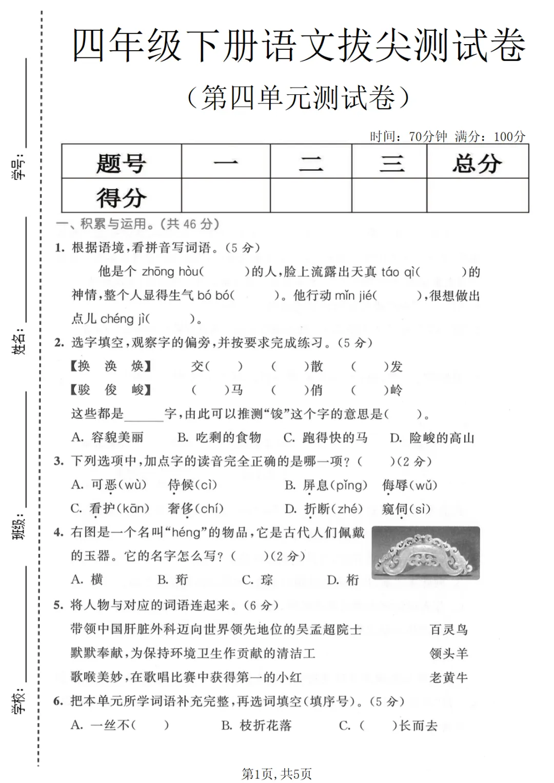【免费下载】四年级(下)语文 第四单元拔尖测试卷,可打印