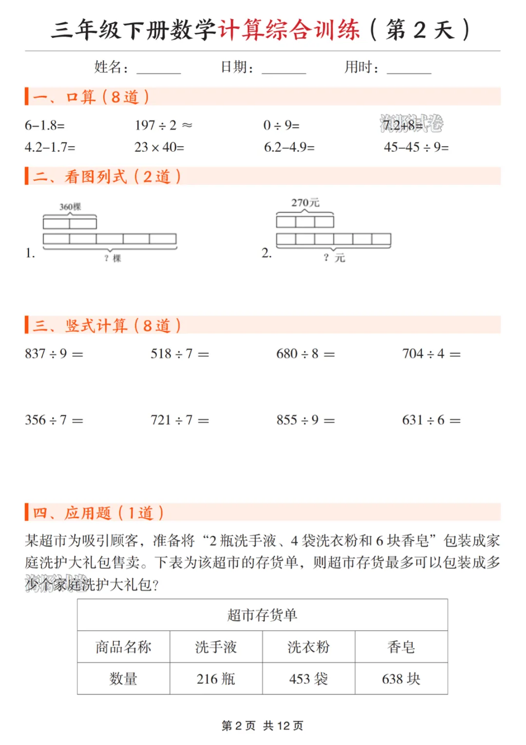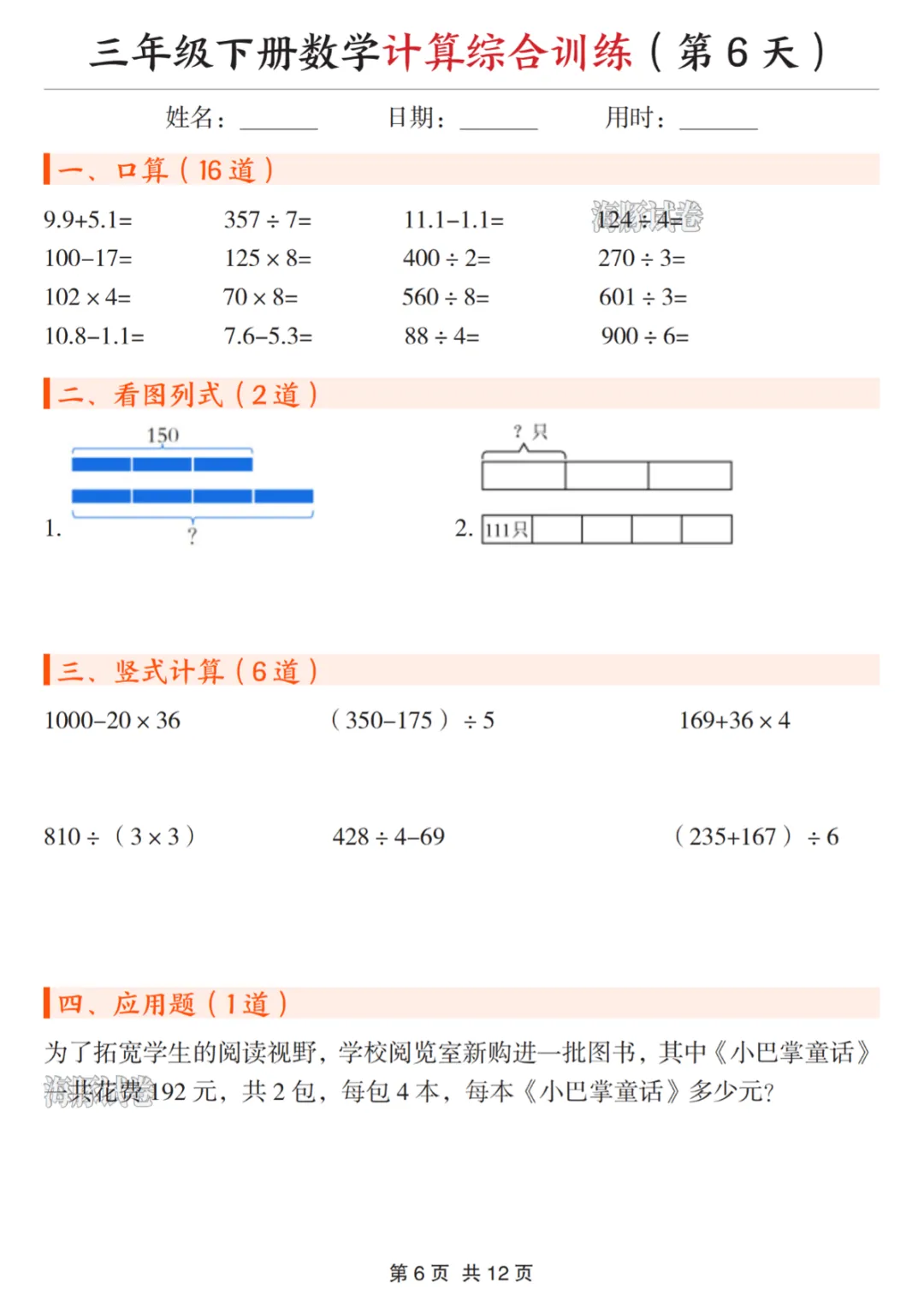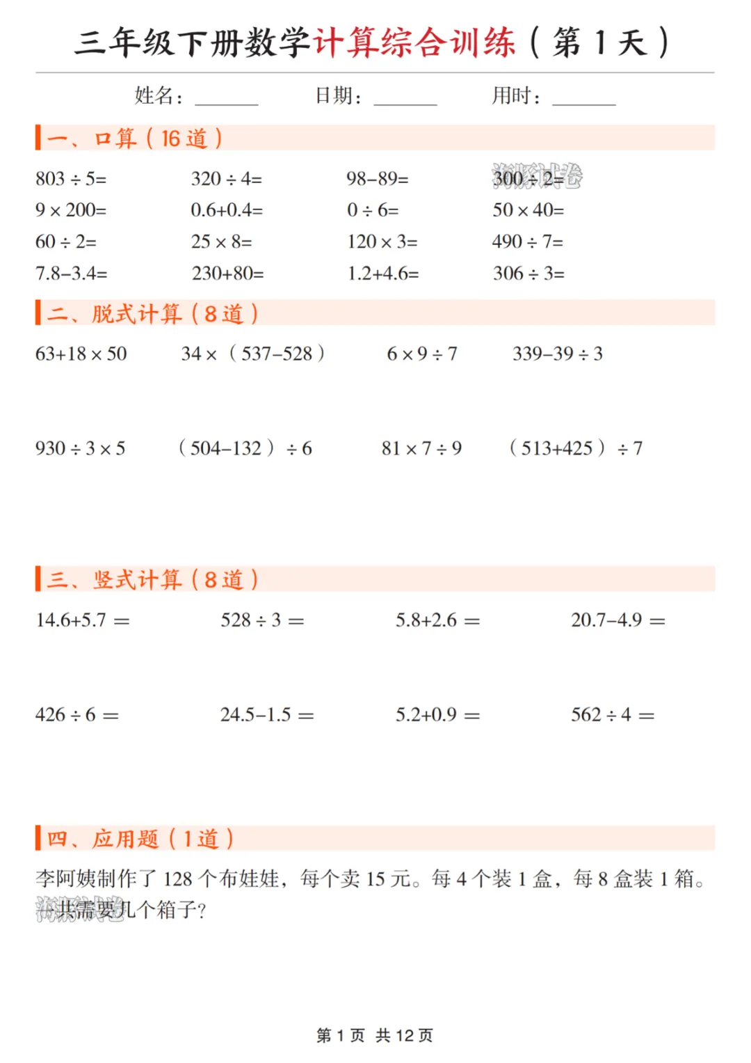 三年级(下)数学计算综合训练