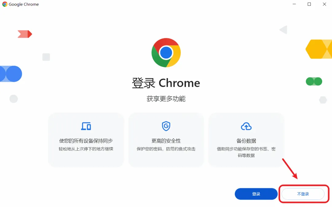 初次安装完成后显示如下图所示的登录 Chrome 页面,在内地网络环境下请点击不登陆。这里登录需要能够正常访问谷歌服务,如果您在海外可以登录后享受信息自动备份、同步等功能。
