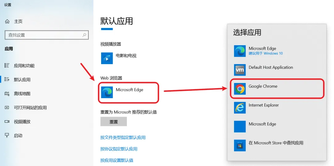 在 Windows 10 上我们点击 设为默认 后会跳转到系统的默认应用设置界面,找到 「Web 浏览器」标签点击下方当前浏览器,随后在选择应用中找到并点击 「Google Chrome」即可设置为默认浏览器。