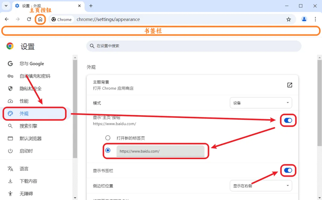 下面我们将主页和书签栏打开,打开设置中的 「外观」 页面,点击 显示"主页"按钮 和 显示书签栏 后的滑块按钮到开启状态。