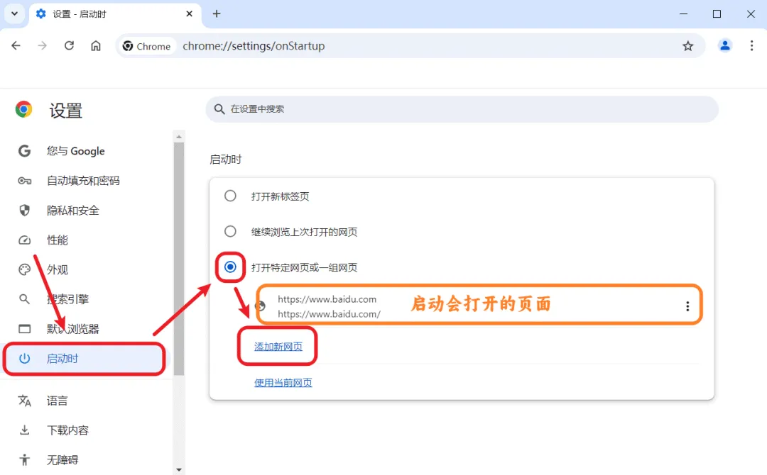 默认 Chrome 在启动的时候是打开新标签页,你可以按照下面的步骤,设置为你想要在启动的时候打开的页面。