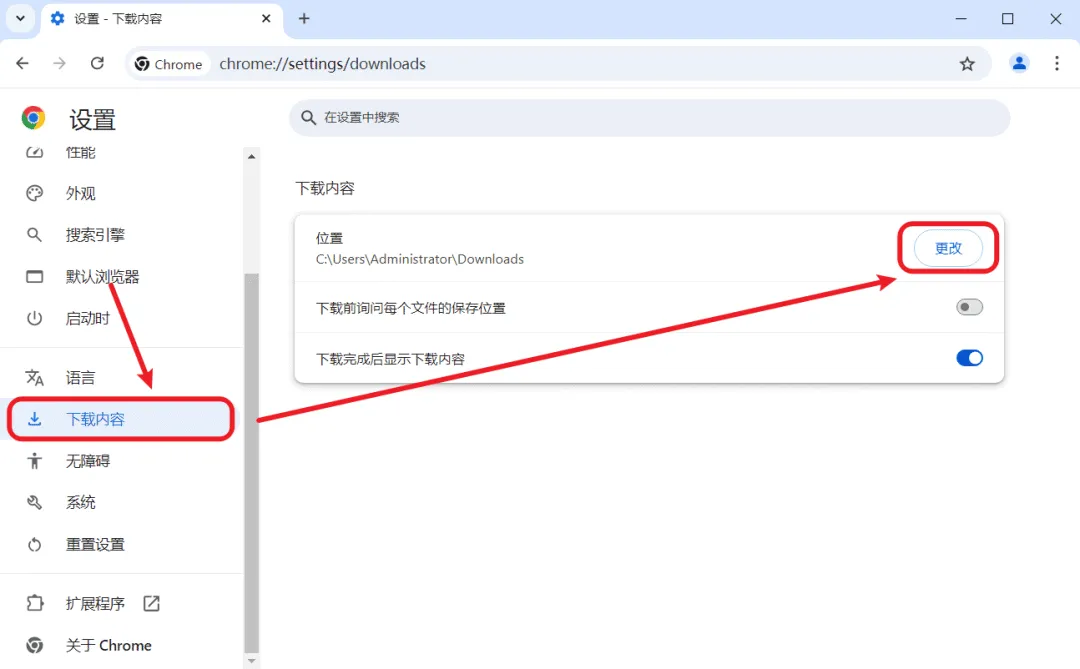 推荐大家将下载位置设置为非 C 盘的其他地方。例如你可以在 D 盘中新建一个 downloads 文件夹。