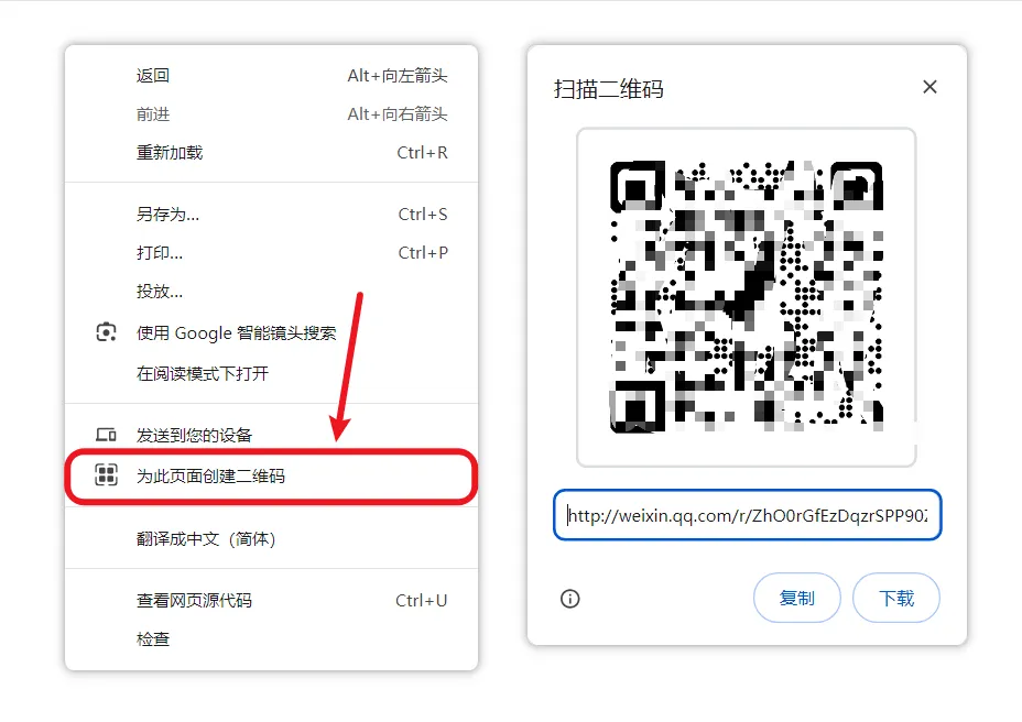 如有移动端访问的需求,Chrome 浏览器提供了一个十分便捷的方式。您只需要在需要访问的页面空白处右键,点击为此页面创建二维码后在界面右上角就会弹出当前页面的二维码。