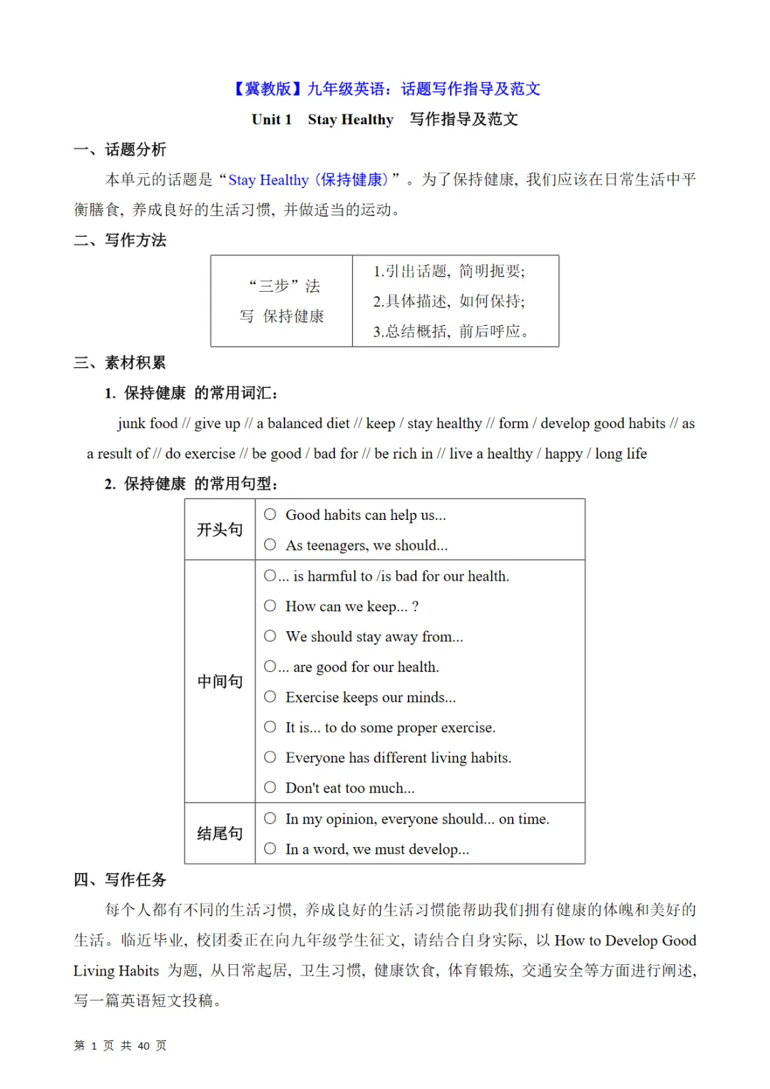 【免费下载】九年级(全1册)英语 话题写作指导及范文(冀教版),PDF电子版,共40页,先保存,以免资源失效