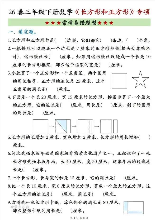今天给大家整理了26春三年级下册数学长方形和正方形专项,转发给朋友或班级群,受益更多人,帮助孩子学习!