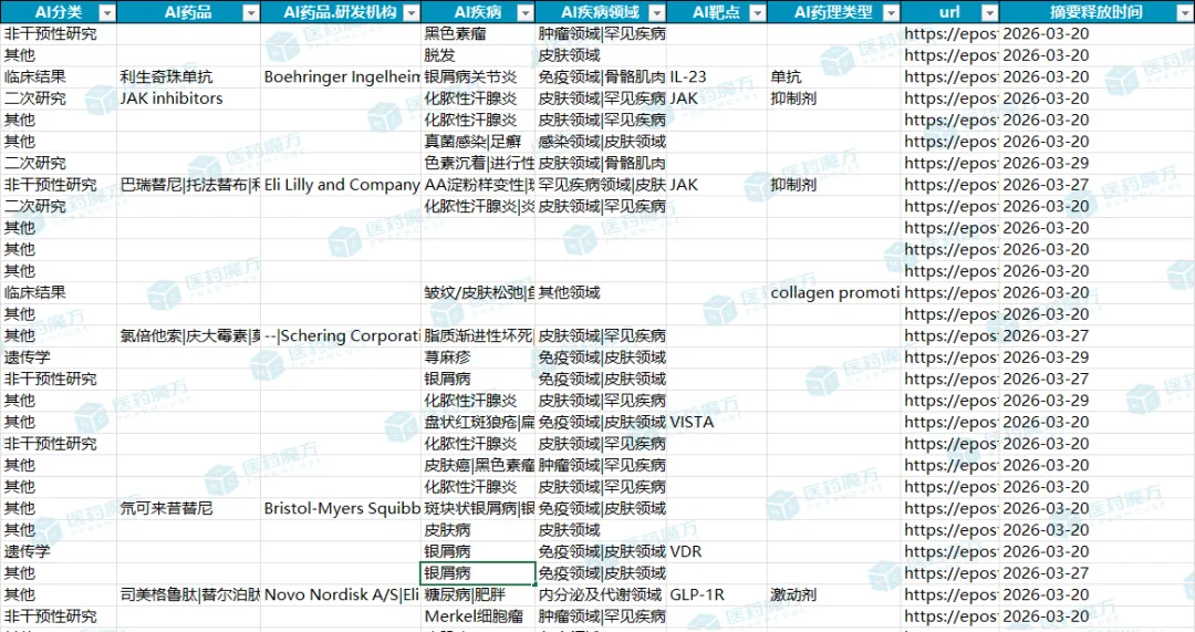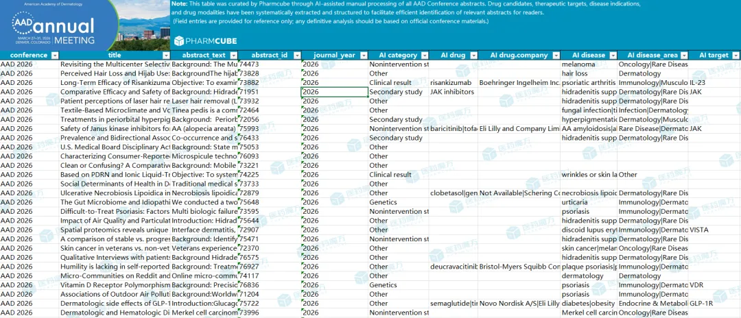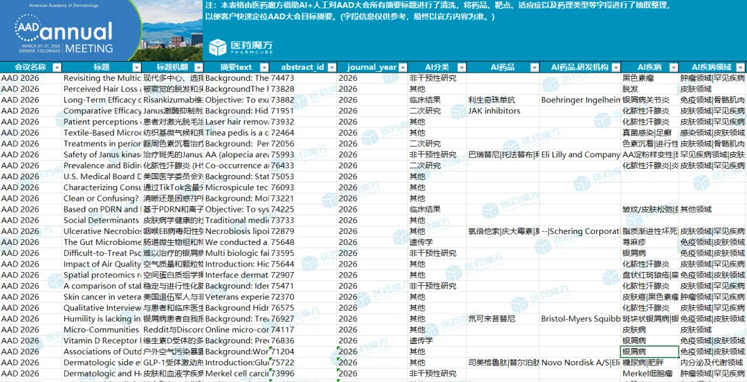 近日,AAD官方公布了本次大会摘要内容。医药魔方对本届大会超2500条摘要内容数据进行了整合清洗,借助AI抽取了每条摘要涉及的药品、靶点、机构、适应症以及药理类型等关键字段,汇总形成了AAD摘要数据合集(提供中英双语版本)。