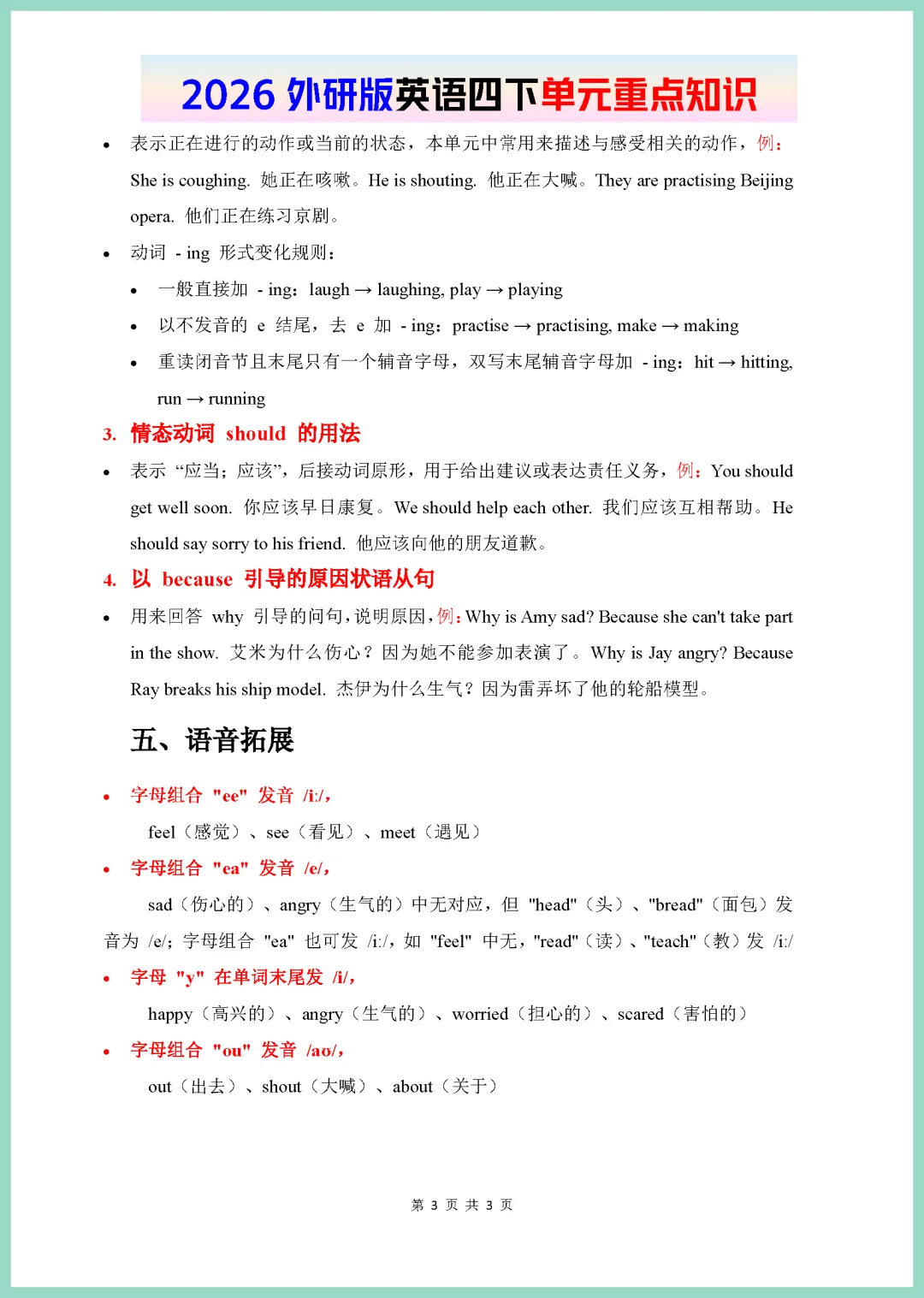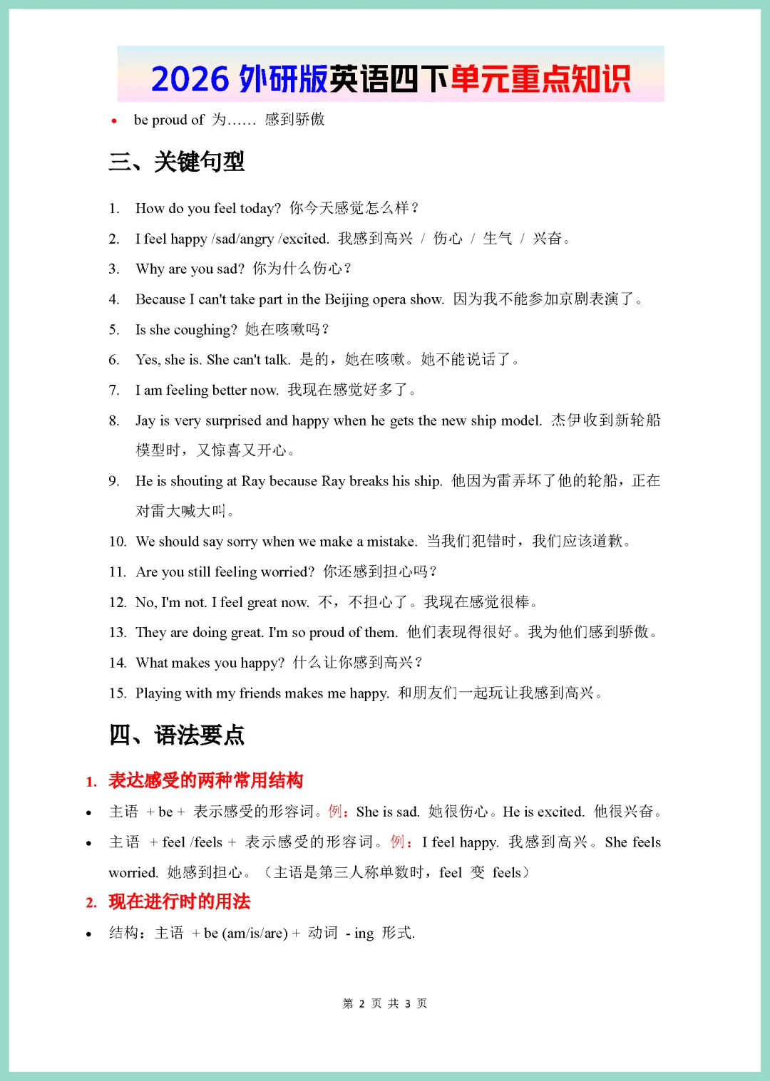各位家长看过来!2026 年春季外研版四年级下册英语第二单元重点知识整理好啦,全套共 3 页精华内容。这份资料紧扣教材,涵盖了本单元核心词汇、必背句型及语法难点,帮助孩子快速梳理知识脉络,轻松攻克学习盲区。无论是课前预习还是课后复习,都能让孩子事半功倍,扎实基础提分更有底气。资料已准备好,需要的家长抓紧打印给孩子练一练吧,新学期一起加油!