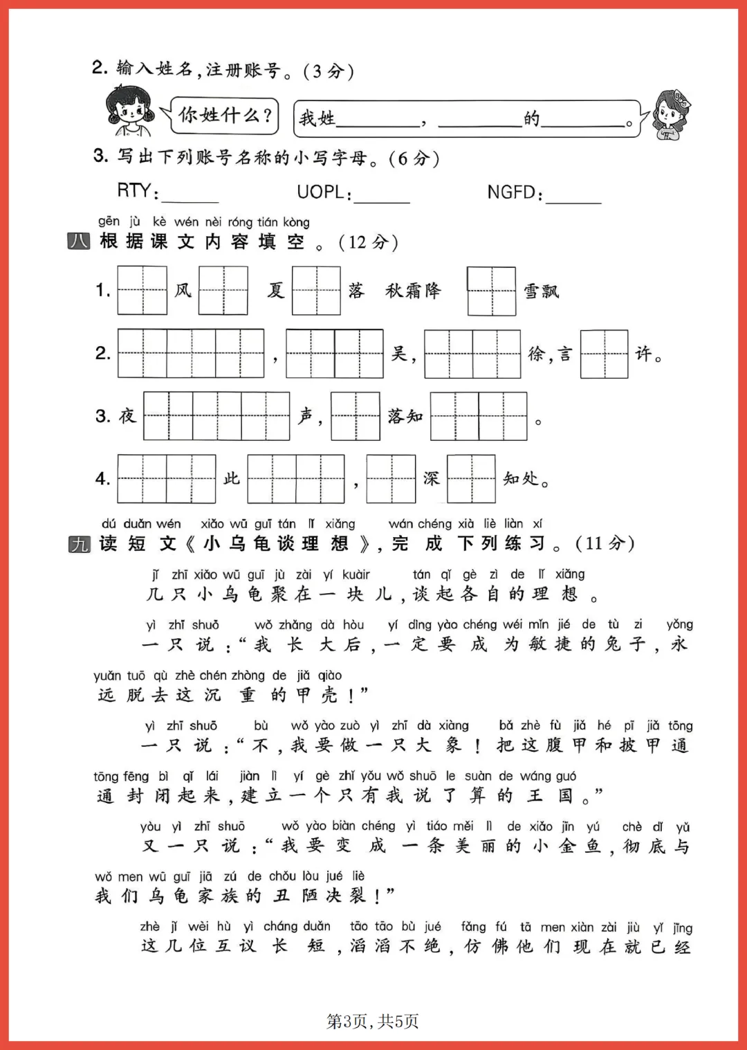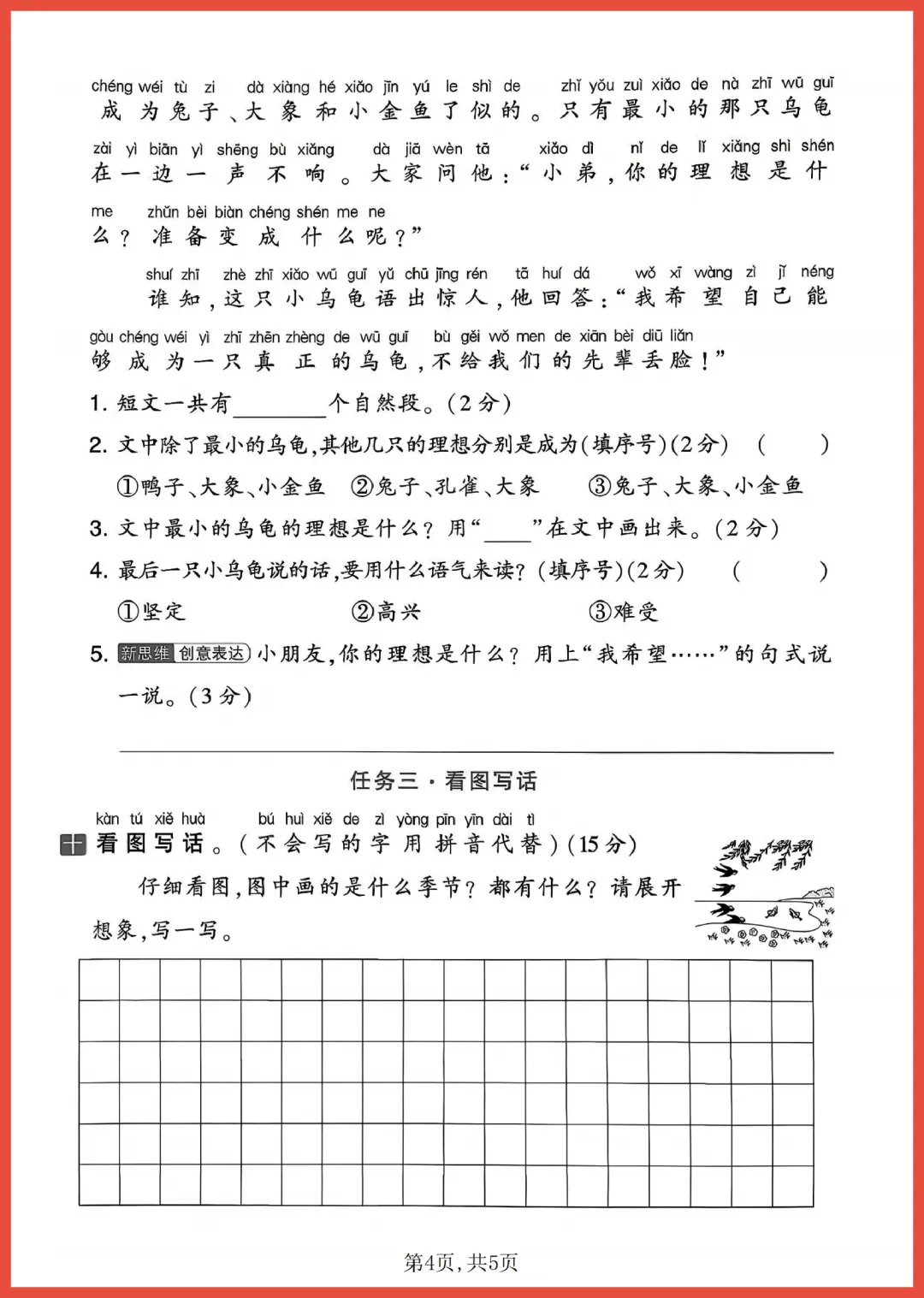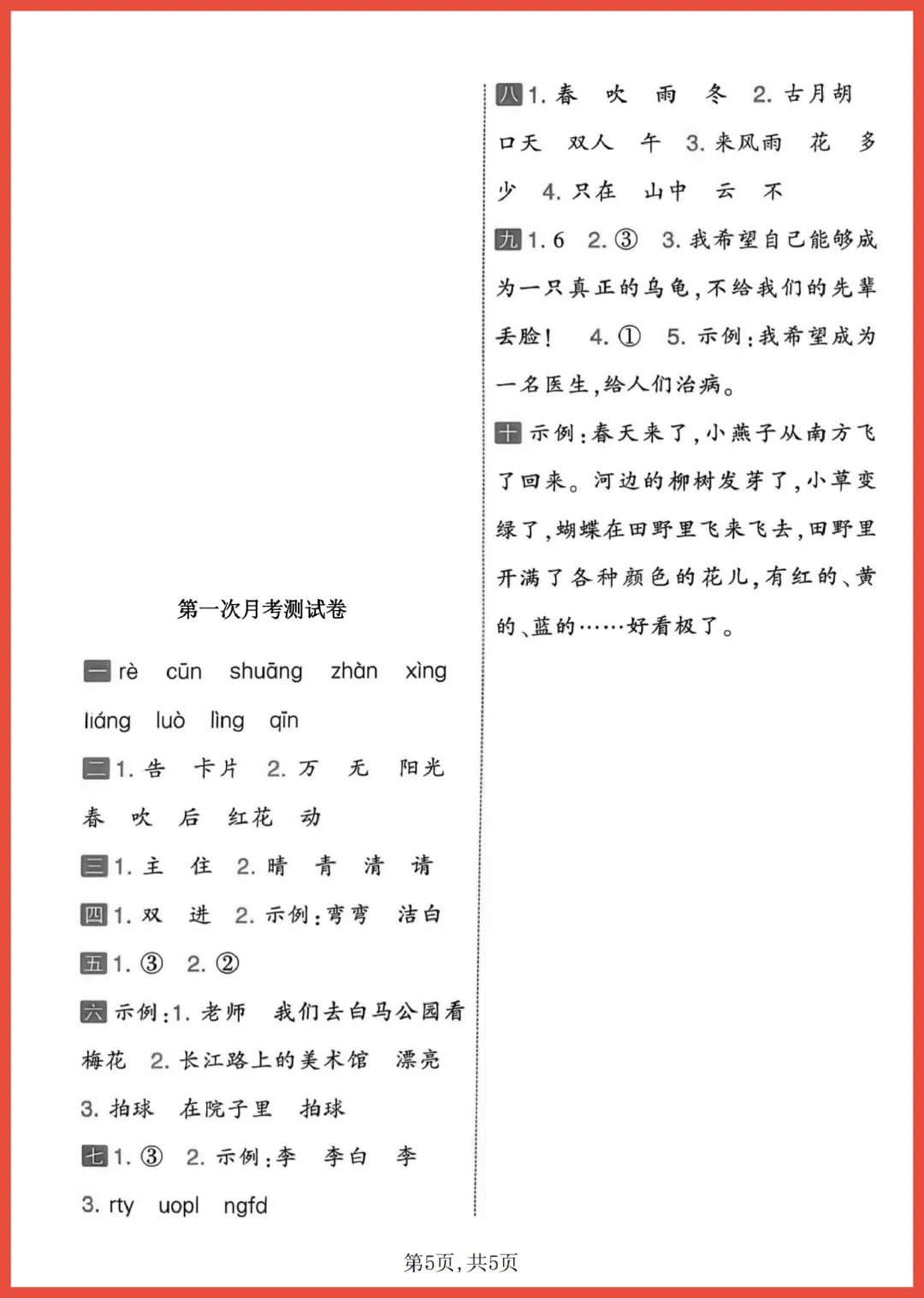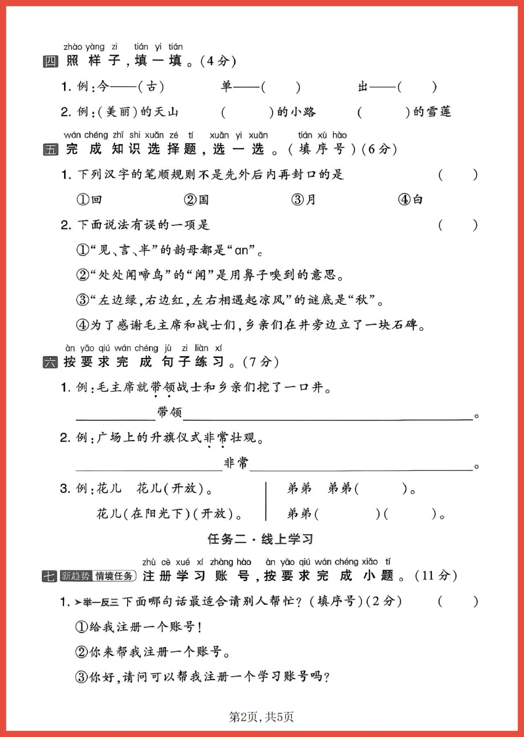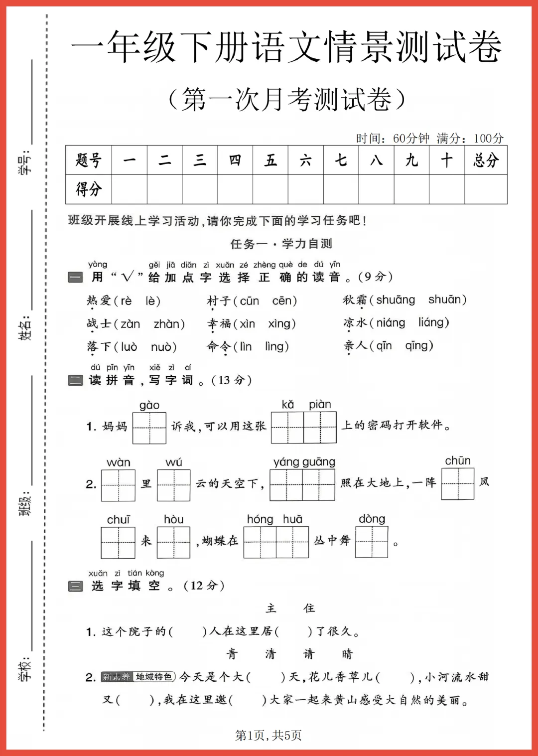 各位家长好!今天分享一份 2024 年通用版一年级下册语文第一次月考情景测试卷,共 5 页精编内容。试卷紧扣教材重点,通过生动的生活情景设计题目,全面考察拼音、字词及基础阅读能力。它能帮助孩子提前适应考试节奏,精准查漏补缺,轻松建立学习自信。考前练一练,效果大不同!需要的家长赶紧收藏并打印出来,让孩子趁热打铁练一练吧!