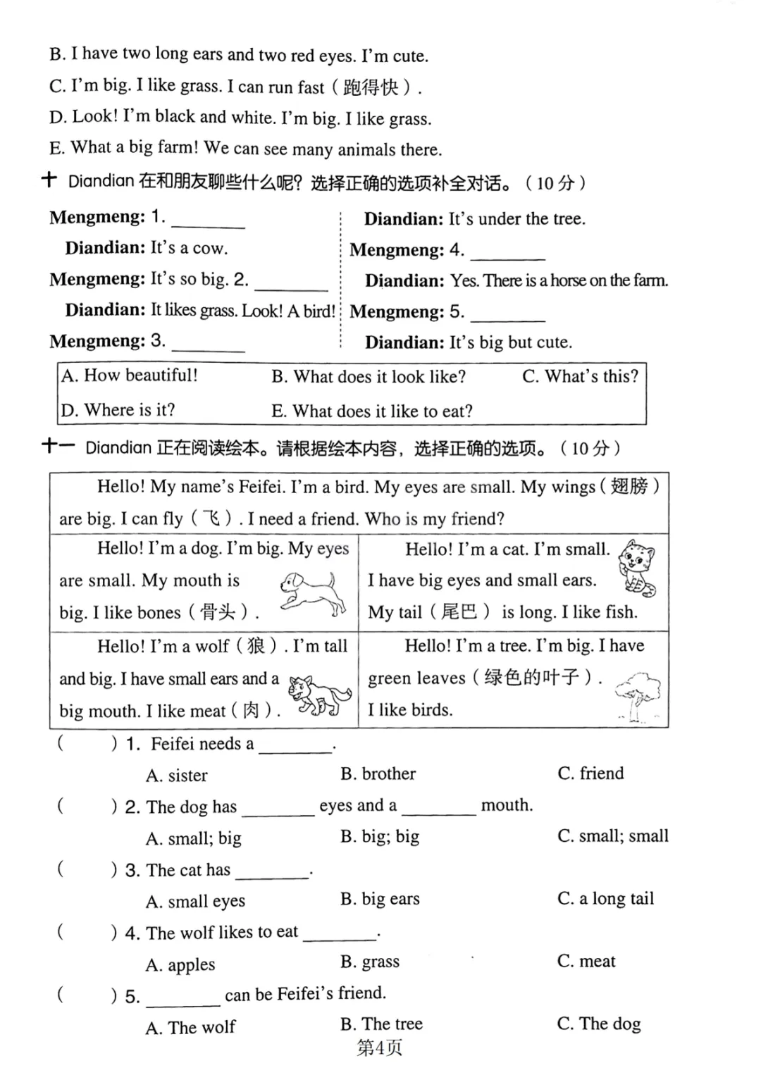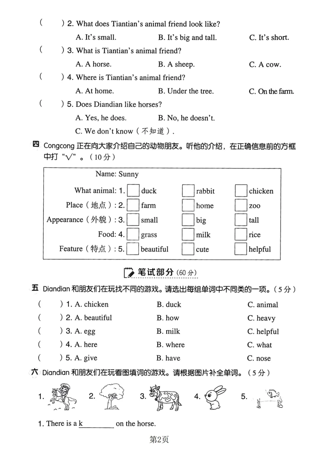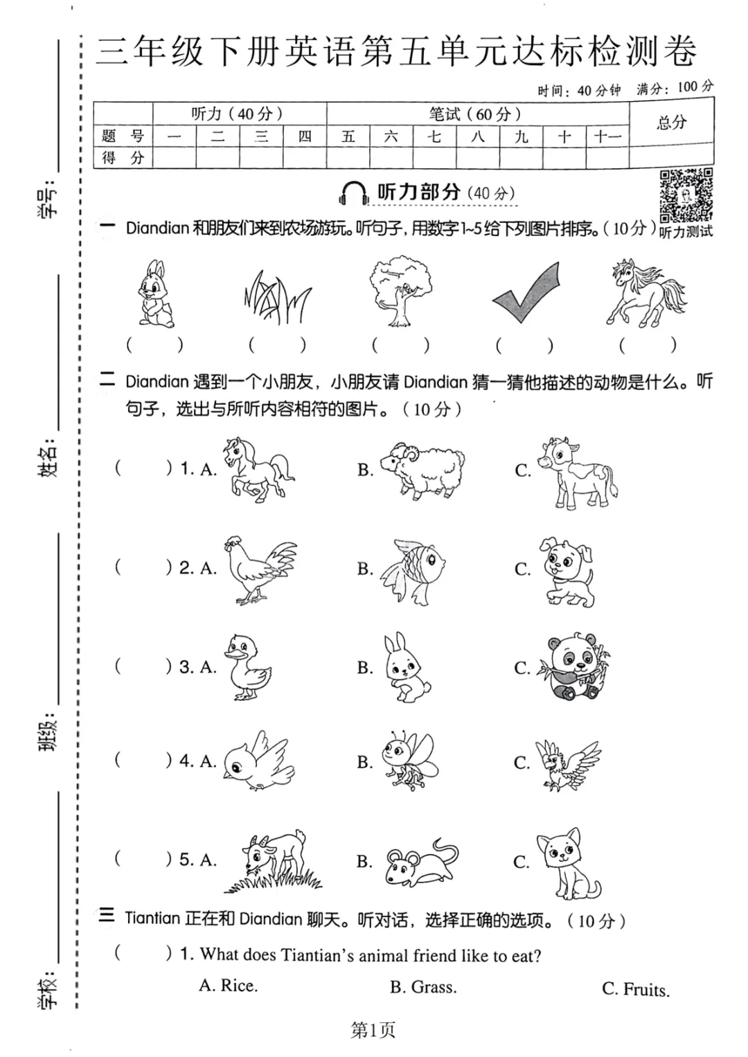 三年级(下)英语 第五单元测试卷《人教精通版》