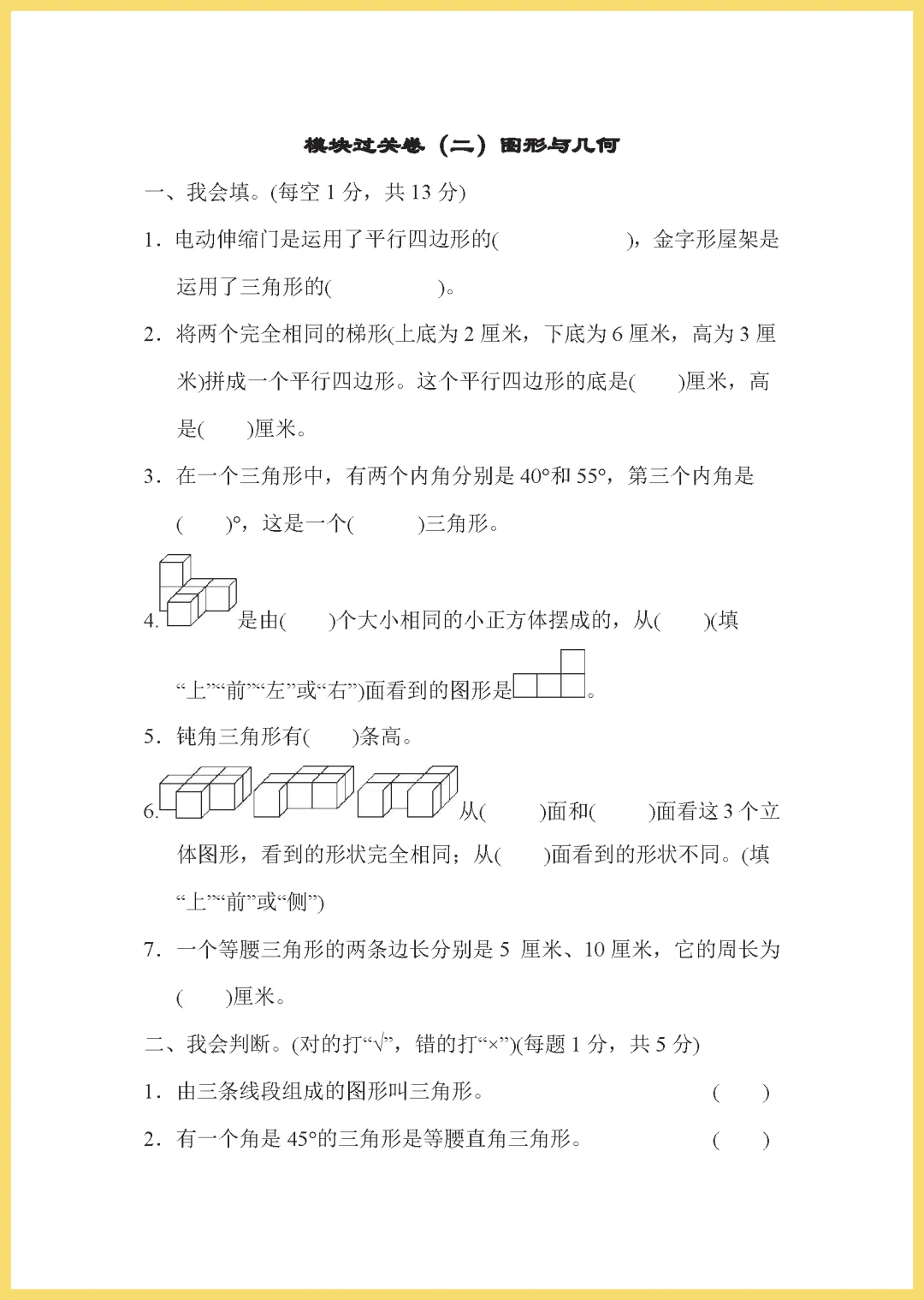 【免费下载】(2)--模块过关卷2 图形与几何【青岛63】四下数学专项练习题 | PDF完整高清电子版可打印