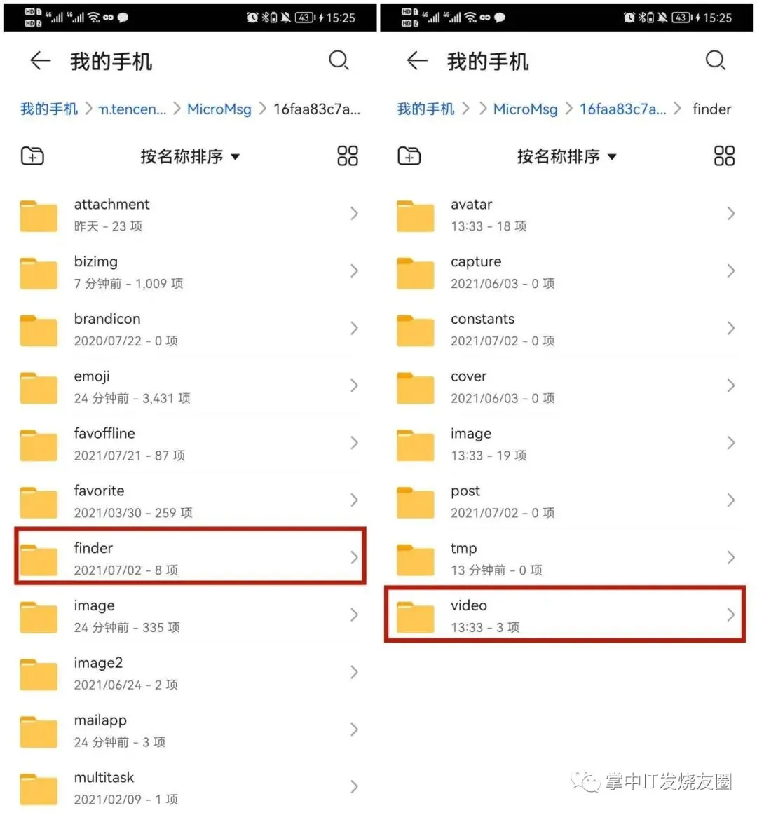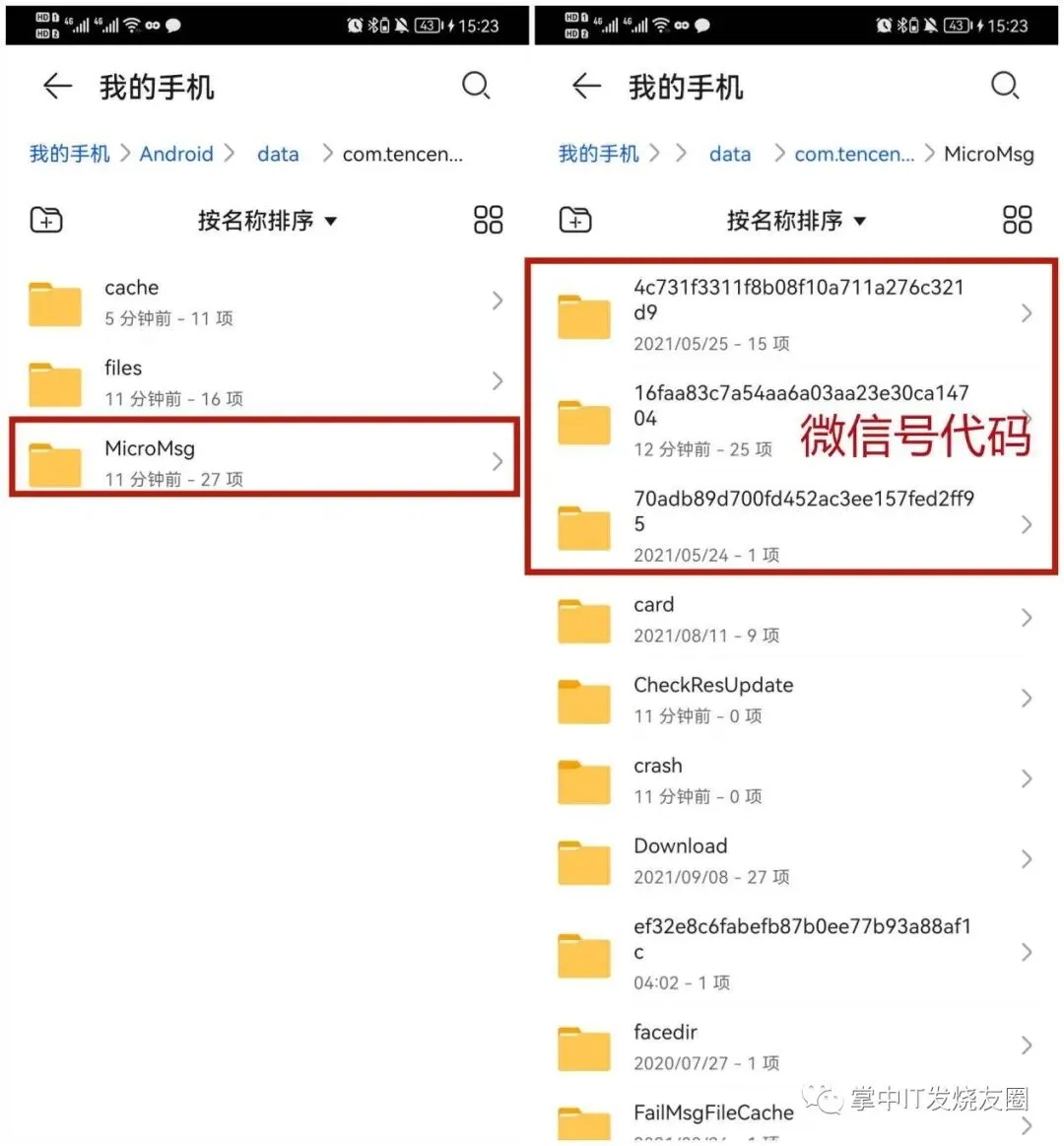 ②.打开文件夹:MicroMsg,这些看似很复杂的文件夹名字,其实是在手机登录的微信号代码,不同的文件夹里放着微信缓存文件。