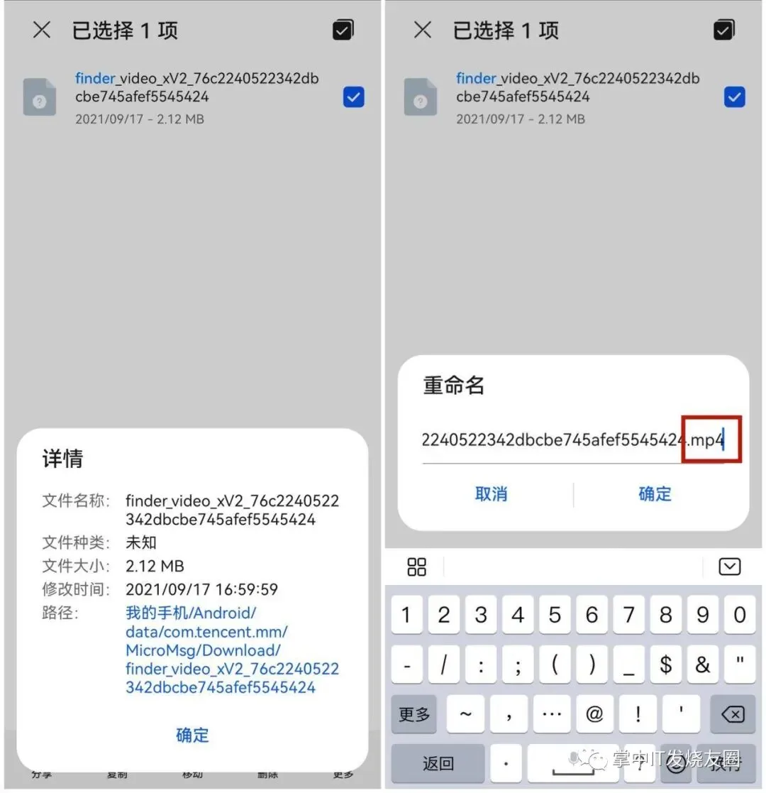 3.视频文件重命名:找到缓存文件后选中,选择“重命名”,在文件名末尾添加 .mp4 后缀保存,这时就会发现文件可以直接在手机上播放了。
