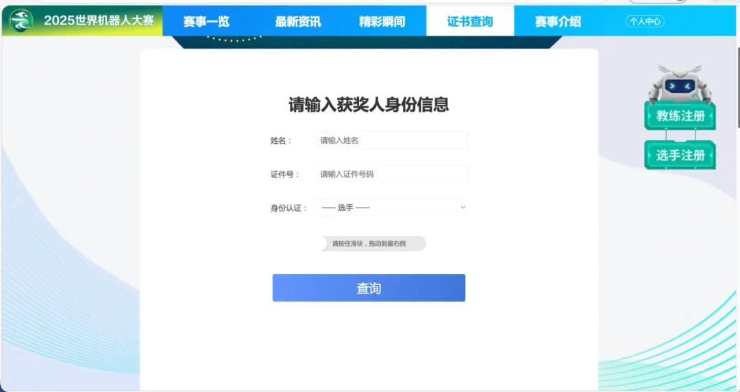 输入获奖人姓名和身份证号(身份认证选“选手”,教练选“教练”)