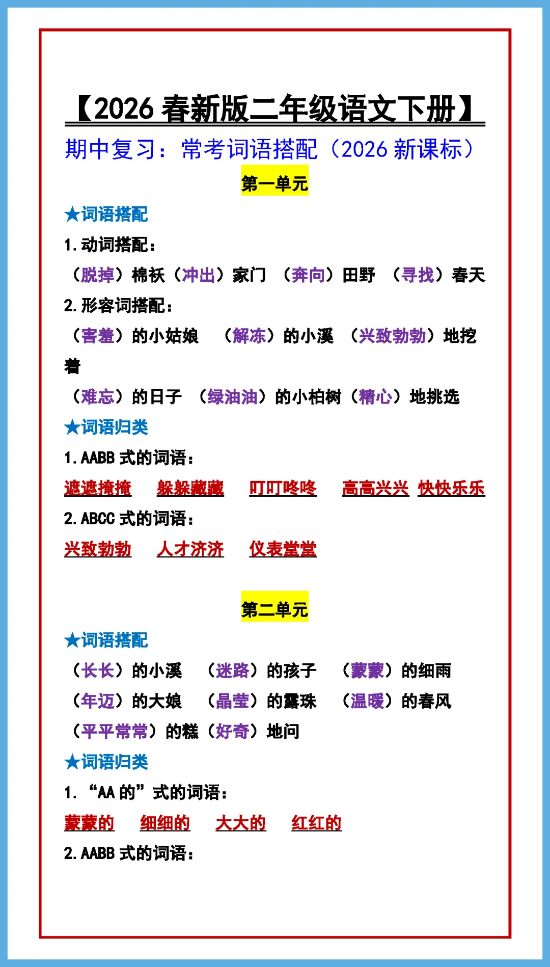 各位家长看过来!这份 2024 年最新版二年级下册语文期中复习专练,专门梳理了常考词语搭配,共 3 页精华内容。资料涵盖了课本重点动词、形容词搭配及易错点,能帮孩子快速夯实基础,避免考试因用词不当丢分。每天花十分钟读一读、练一练,让孩子语感倍增,答题更自信。期中考试在即,需要的家长抓紧打印给孩子练一练吧,助力孩子轻松拿高分!