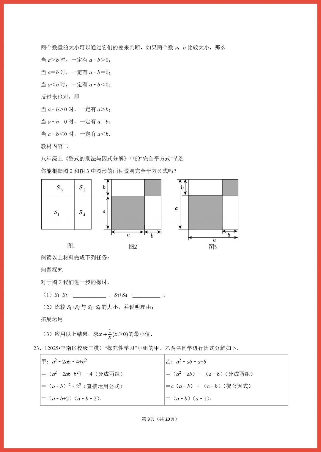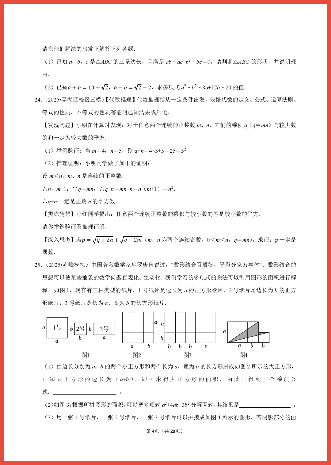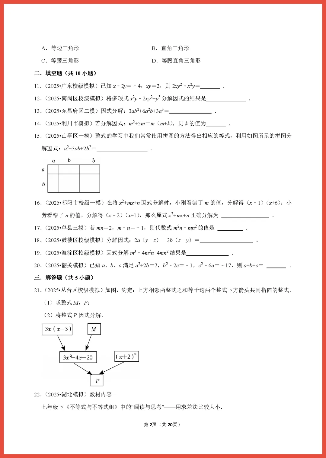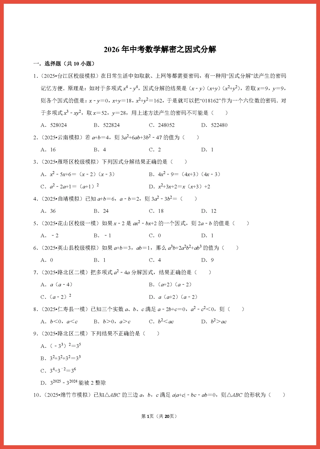 各位家长注意啦!这份 2024 最新版中考数学一轮复习《因式分解专项练习》来啦,专为初三学子打造,整整 20 页干货满满。资料紧扣考纲,精选高频考点与易错题型,涵盖提公因式、公式法等核心技巧,帮助孩子系统梳理知识盲区,通过针对性训练快速提升解题速度与准确率,轻松攻克代数难关。打好地基才能建高楼,趁现在赶紧下载打印,让孩子每天练一练,稳稳拿下中考数学基础分!