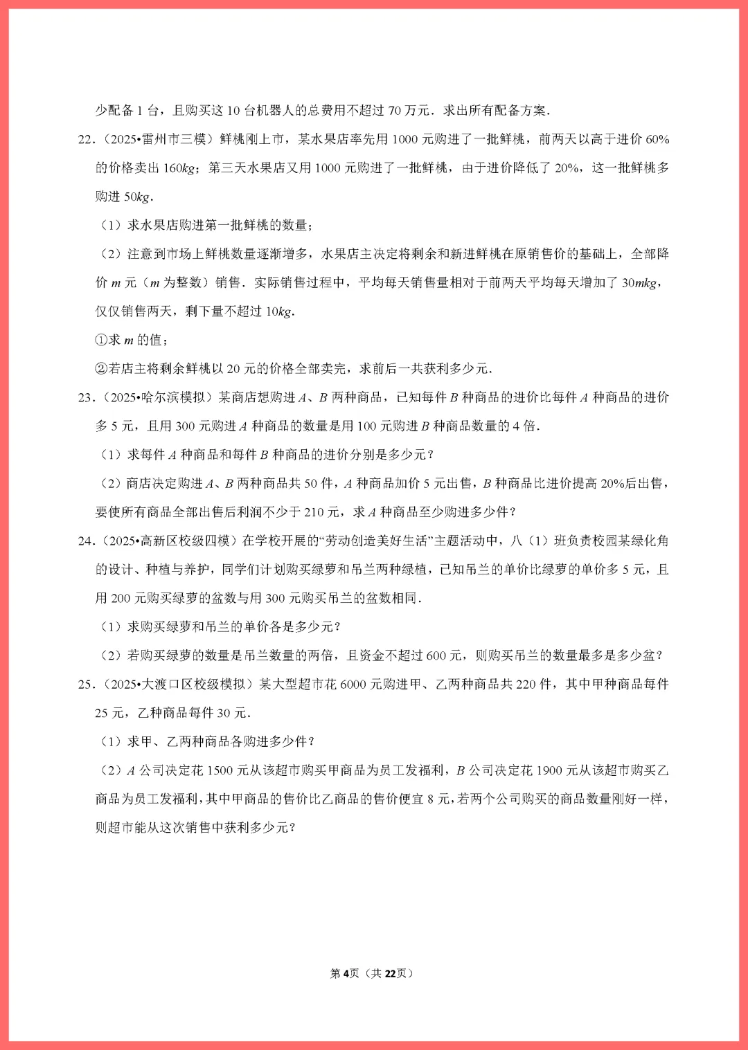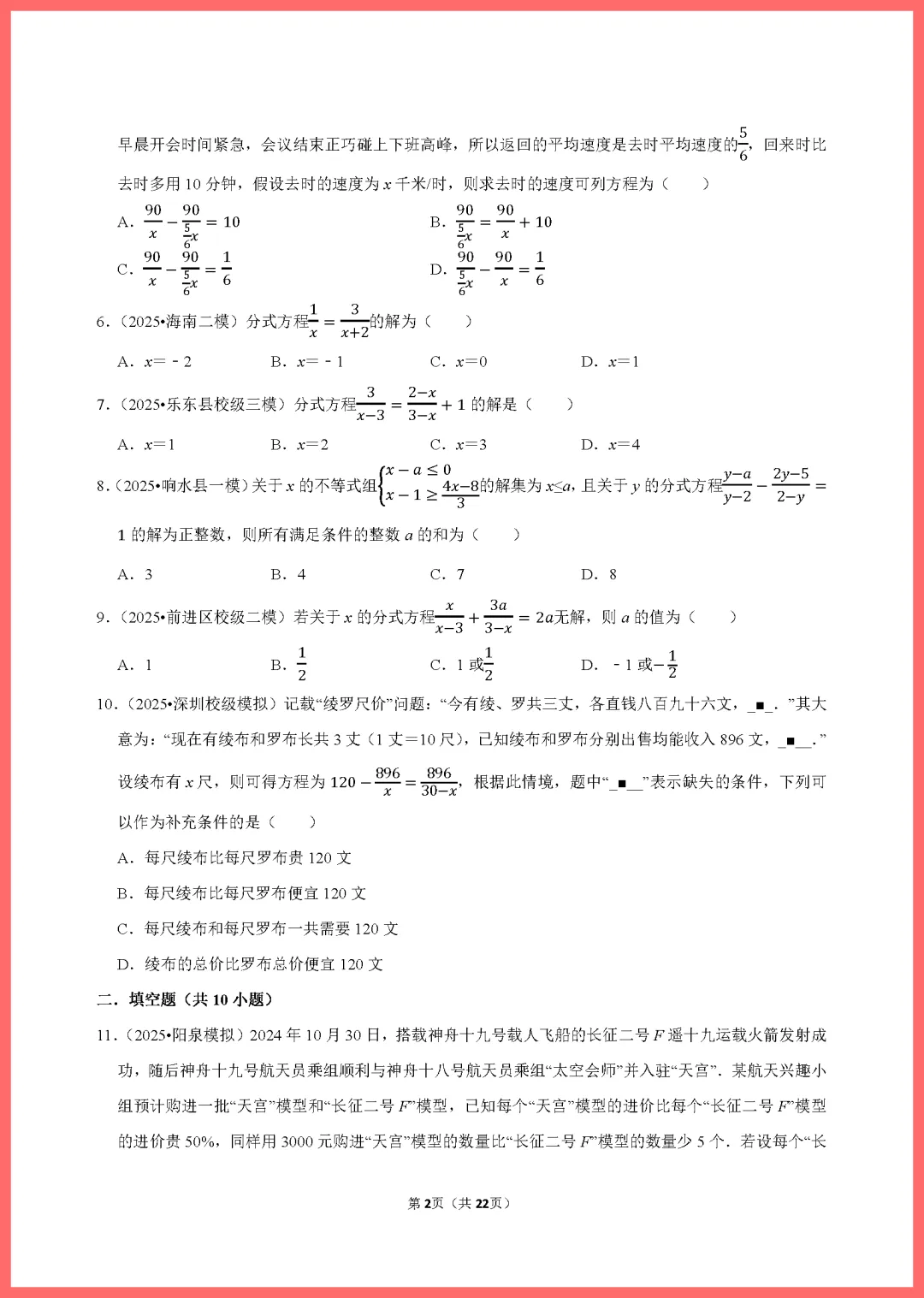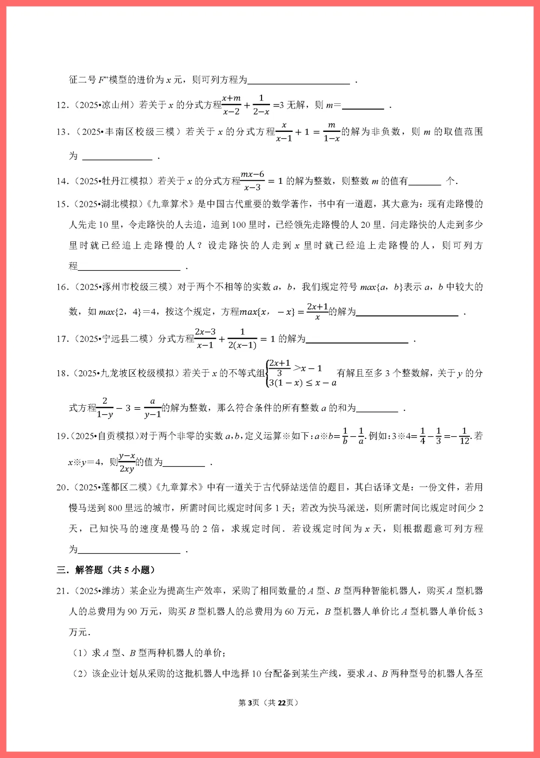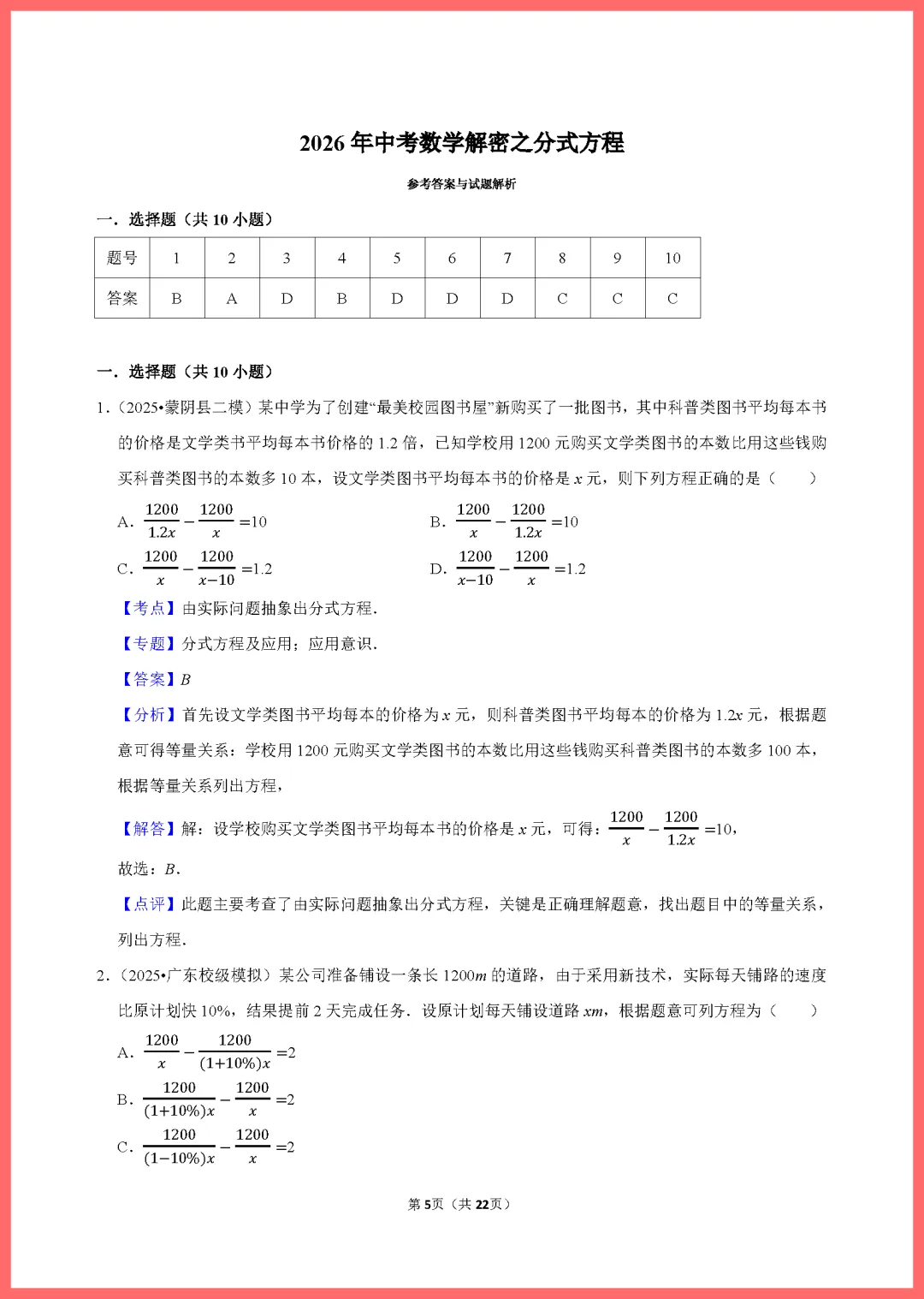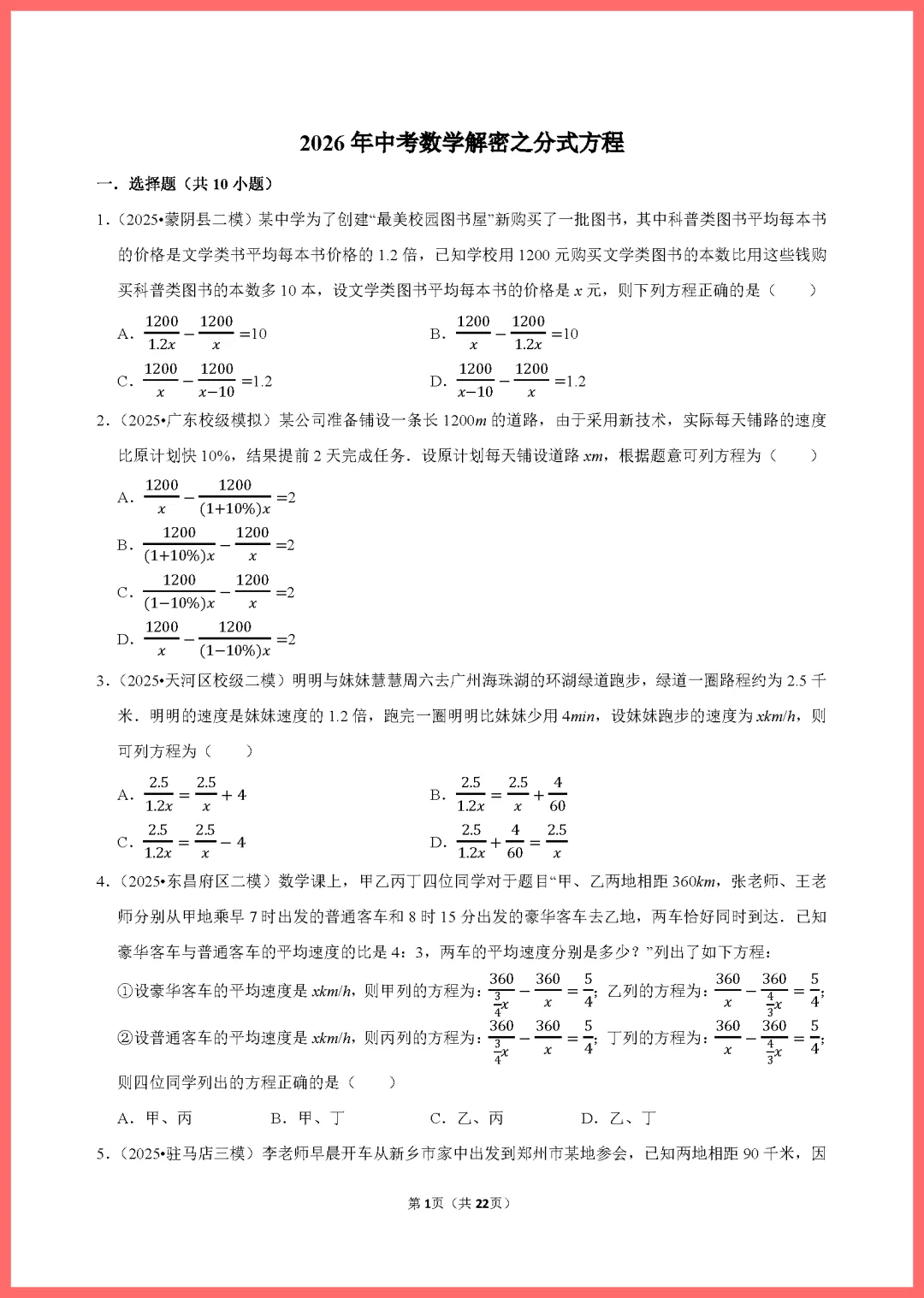 各位家长好!今天分享一份2024版中考数学一轮复习专用资料——《分式方程练习》,共22页精编习题。本套资料紧扣考纲,涵盖分式方程的解法、应用题及易错点辨析,题型丰富且难度分层。通过系统训练,能帮孩子夯实计算基础,突破解题瓶颈,有效提升应试信心。资料排版清晰,非常适合居家自测或查漏补缺。需要的家长抓紧打印给孩子练一练吧,助力孩子备战中考,稳步提分!