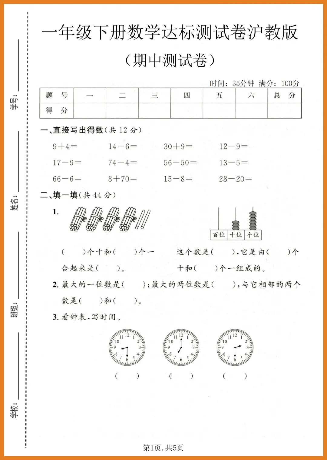 各位家长看过来!这份 2024 年沪教版一年级下册数学期中达标测试卷来啦,共 5 页精编内容。试卷紧扣教材重点,涵盖前半学期核心知识点,题型丰富多样,能帮孩子全面查漏补缺,熟悉考试节奏,轻松建立自信。考前练一练,效果看得见!需要资料的家长别犹豫,赶紧打印出来让孩子做一做,为期中考试做好充分准备吧!