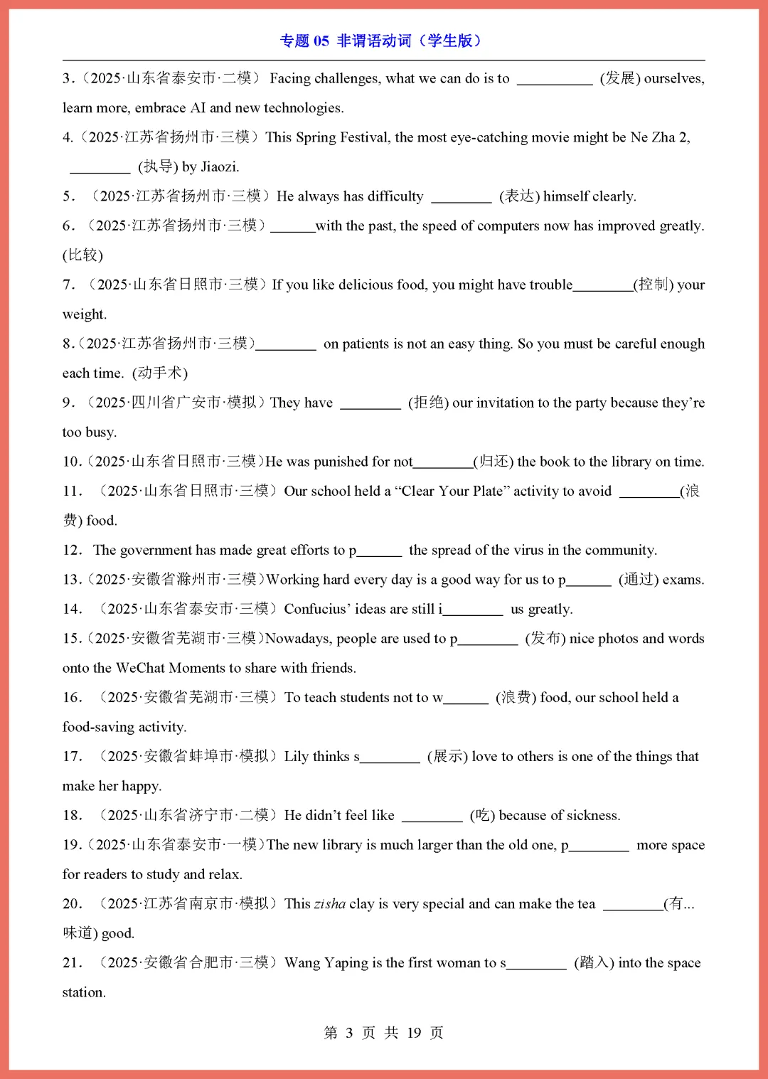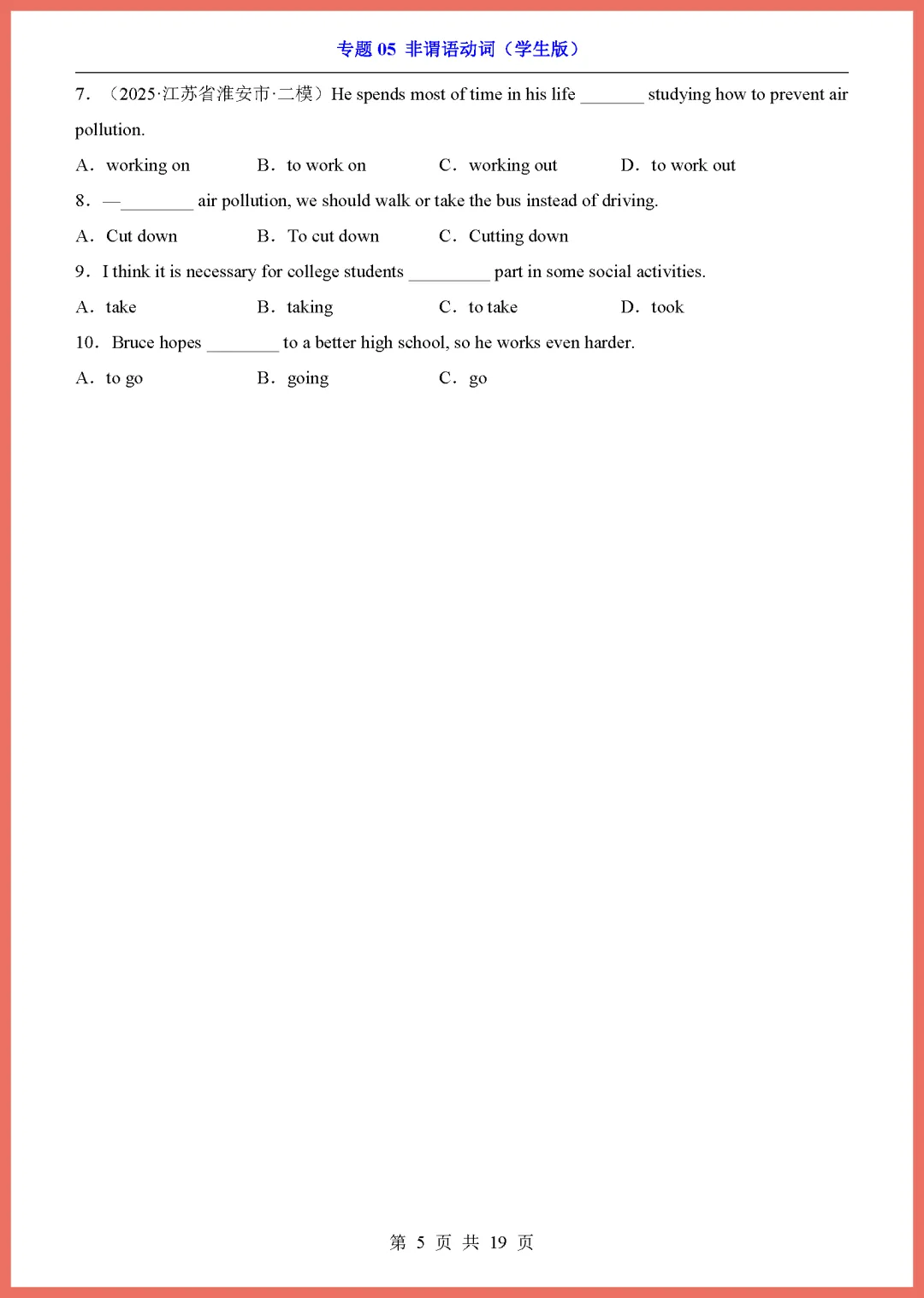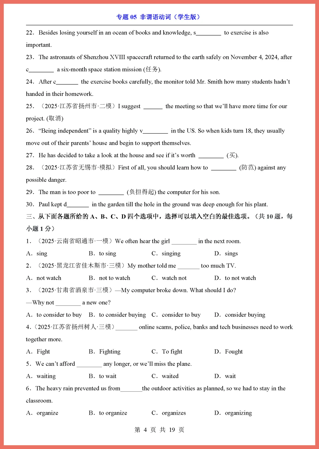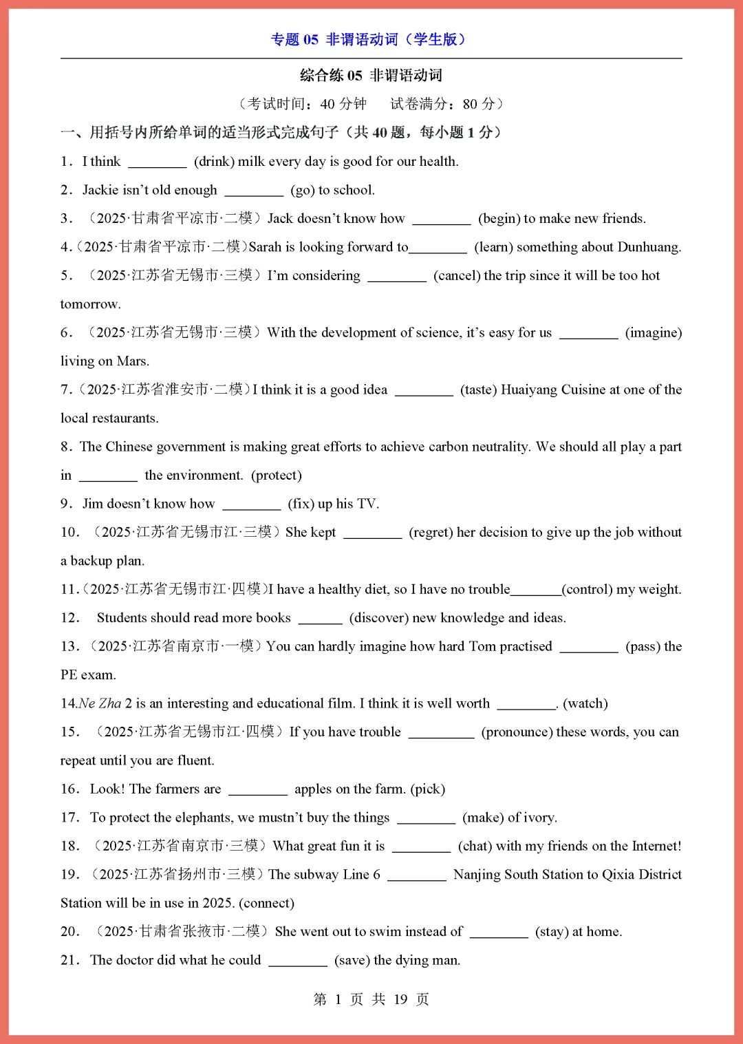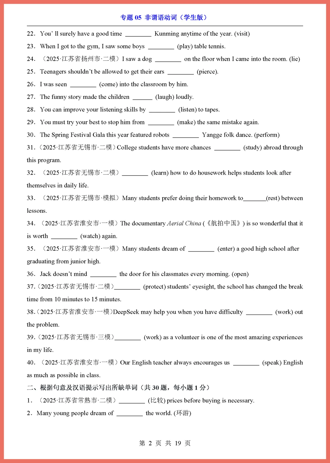 各位家长注意啦!2026 中考英语专项复习重磅来袭,今天分享的是专题 05《非谓语动词》,共 19 页精编资料。这份文档系统梳理了不定式、动名词和分词的核心用法,精选高频考点与易错题型,能帮孩子彻底攻克语法难关,提升解题准确率。内容紧扣新课标,解析详细,非常适合居家自测或查漏补缺。备战中考刻不容缓,需要的家长赶紧收藏并打印出来,让孩子趁热打铁练一练吧!