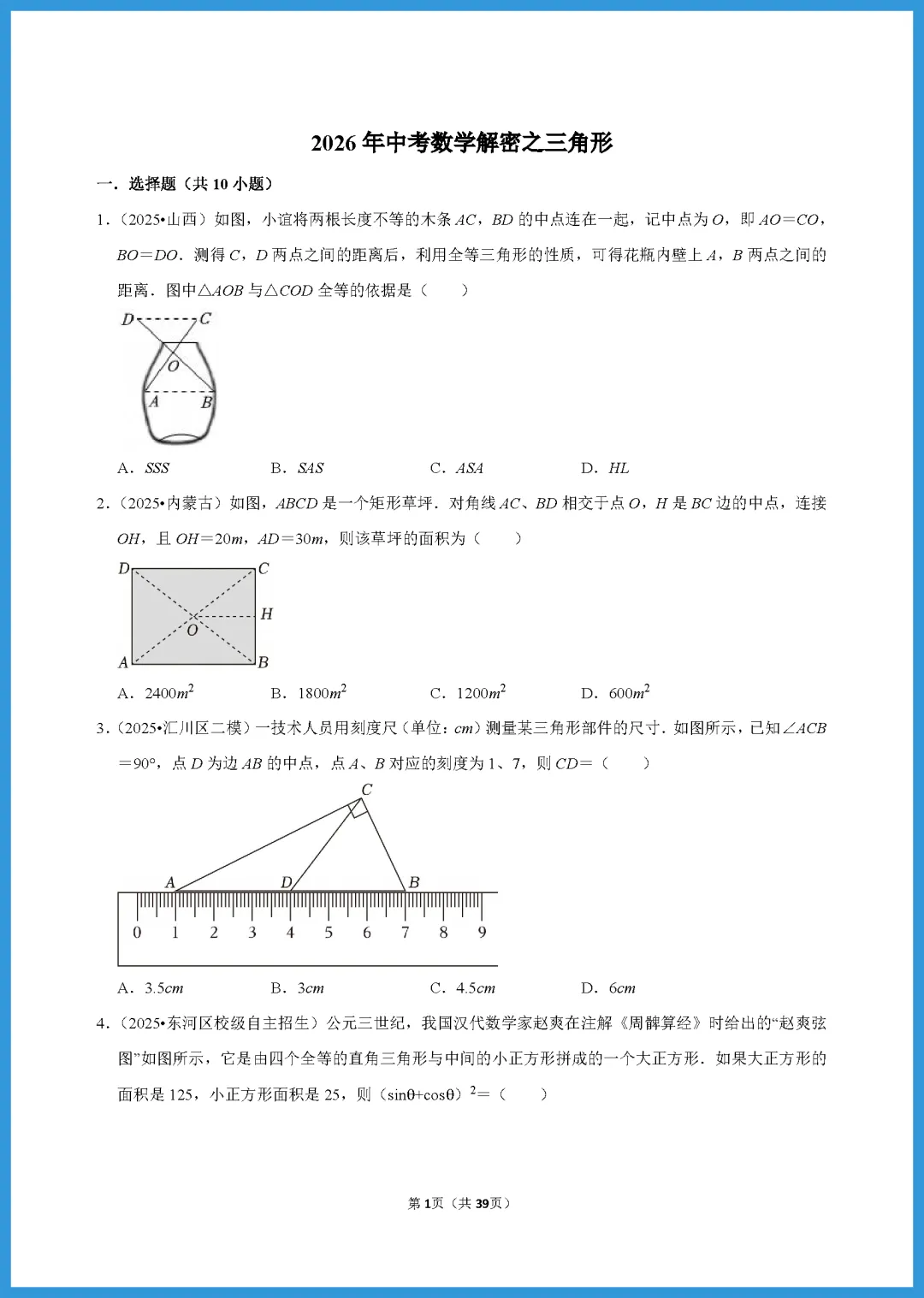各位家长注意啦!这份2024版中考数学一轮复习《三角形专项练习》重磅来袭,专为初三学子打造,整整39页干货满满。资料系统梳理了三角形全等、相似及勾股定理等核心考点,精选典型例题与易错陷阱,帮助孩子夯实基础、构建知识网络,轻松攻克几何难关。每天练一练,解题思路更清晰,考试信心更充足!名额有限,需要的家长抓紧打印给孩子练一练吧,让孩子在中考中稳拿高分!