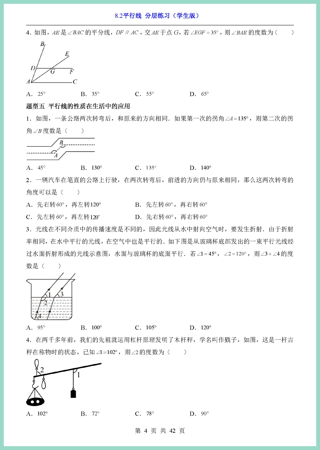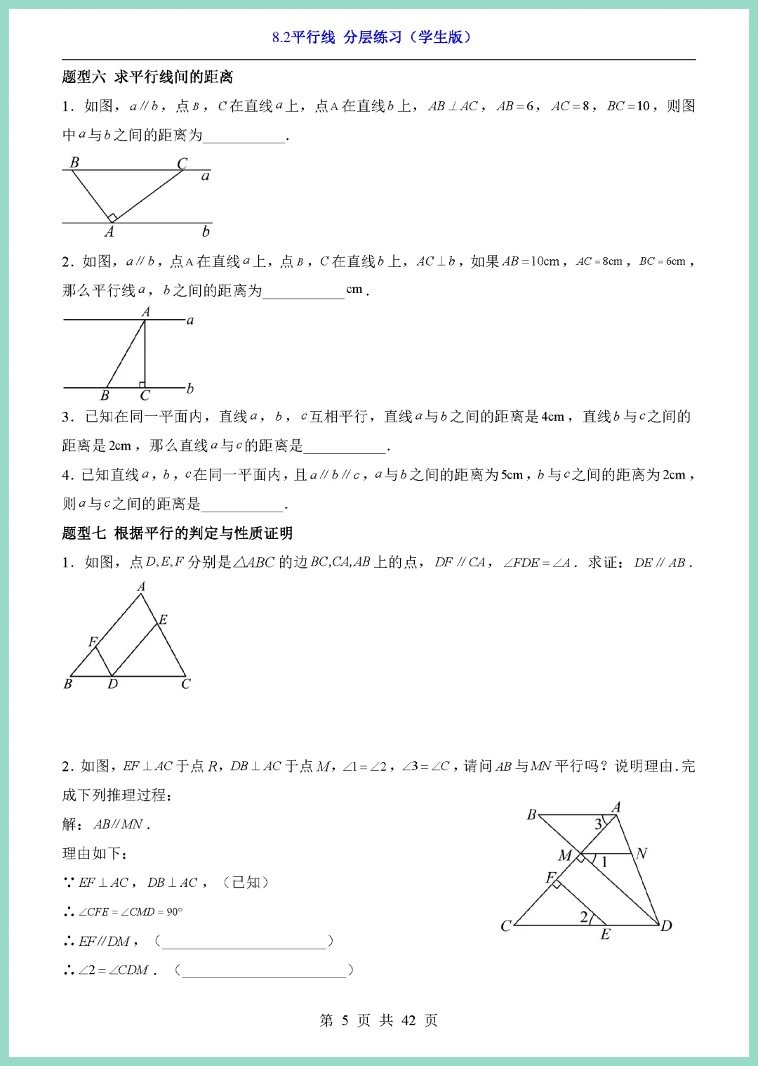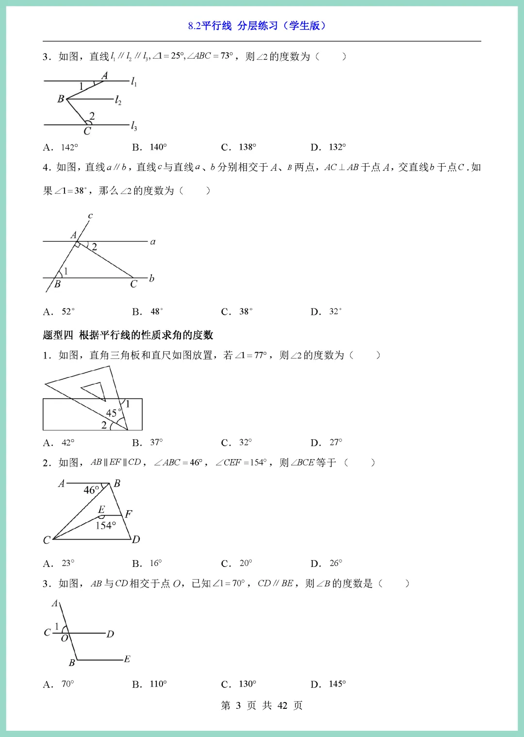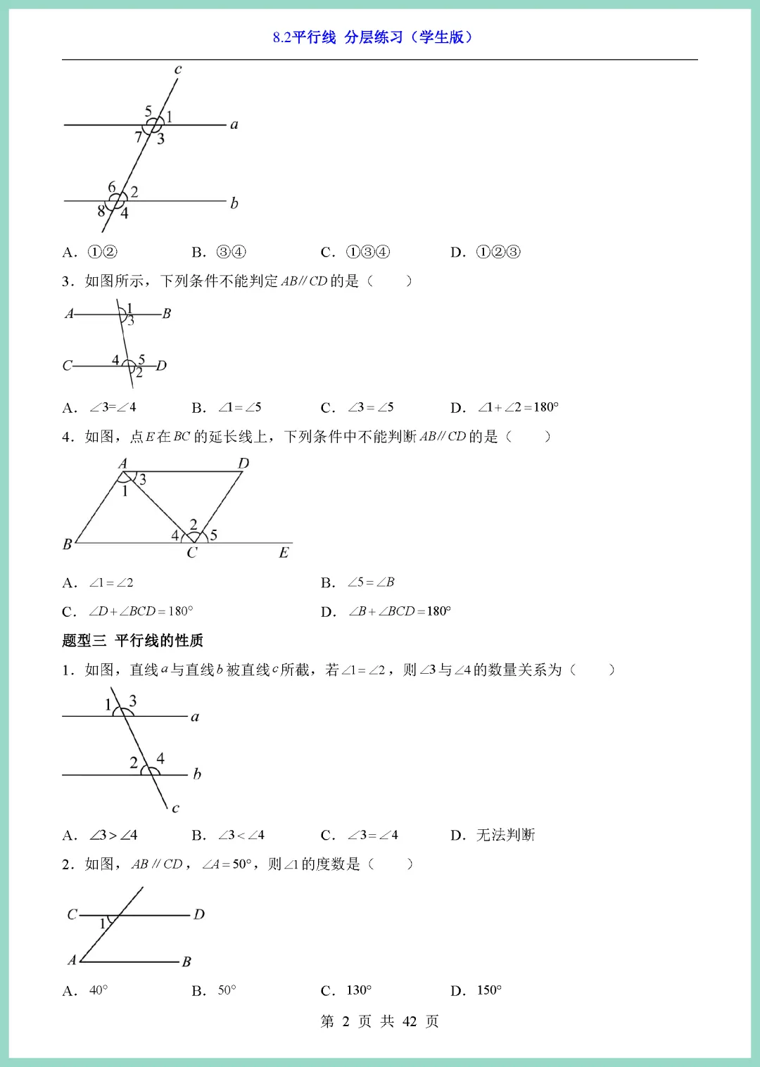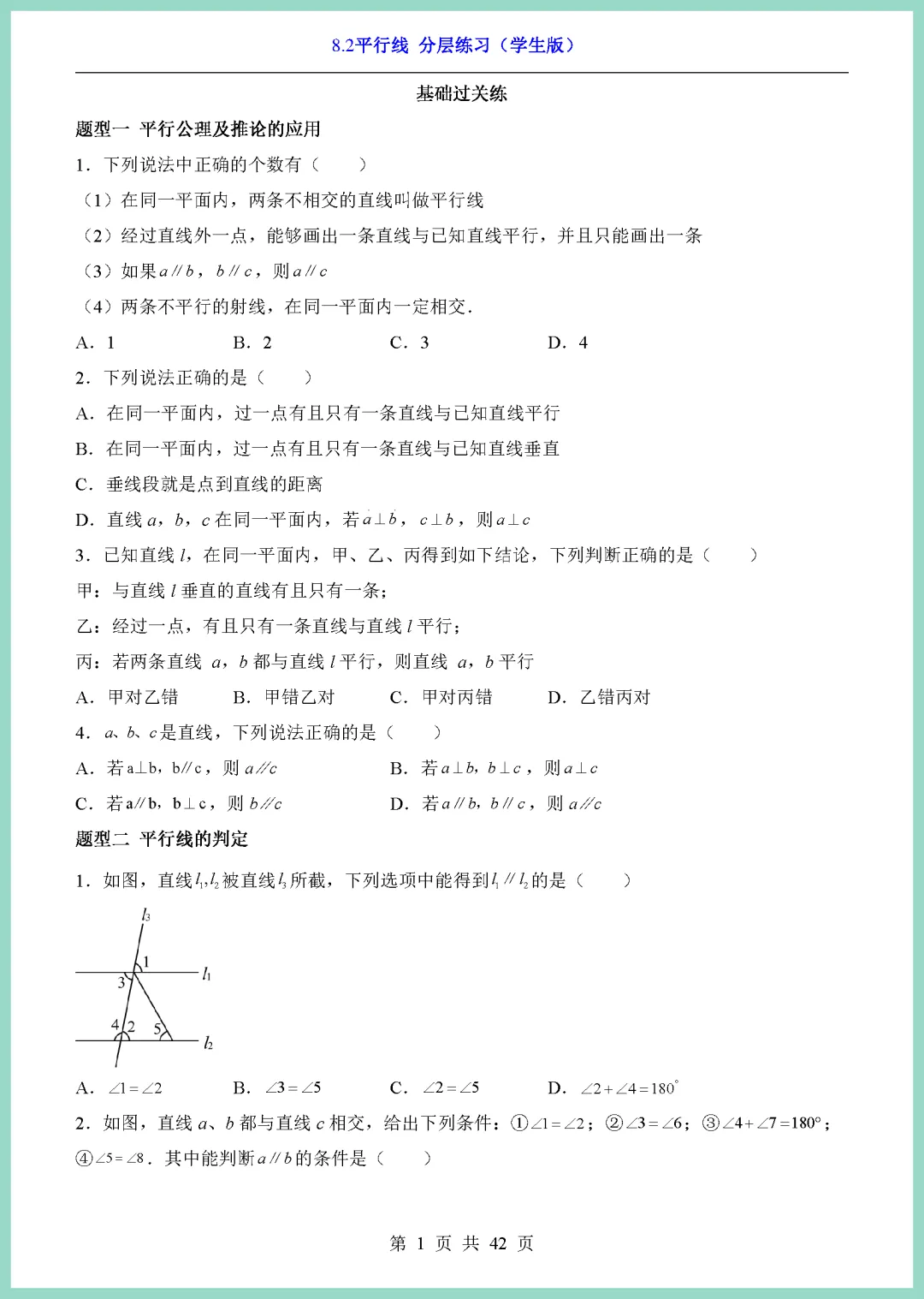 【免费下载】七年级(下)数学8_2平行线_分层练(青岛版) | PDF完整高清电子版可打印