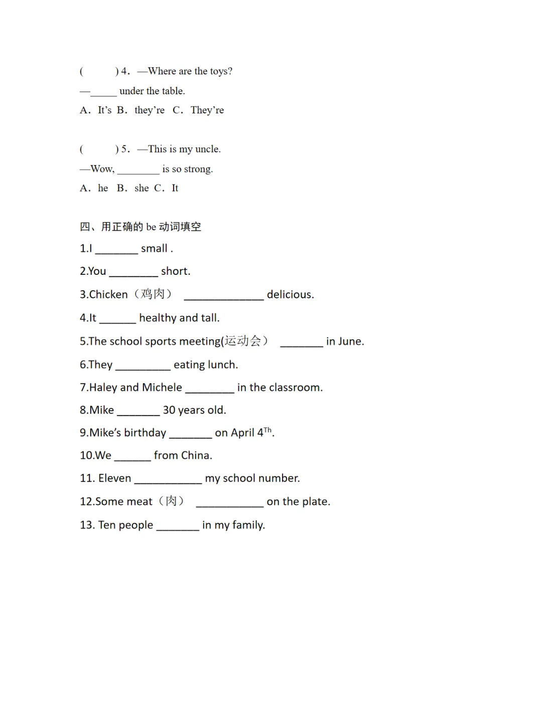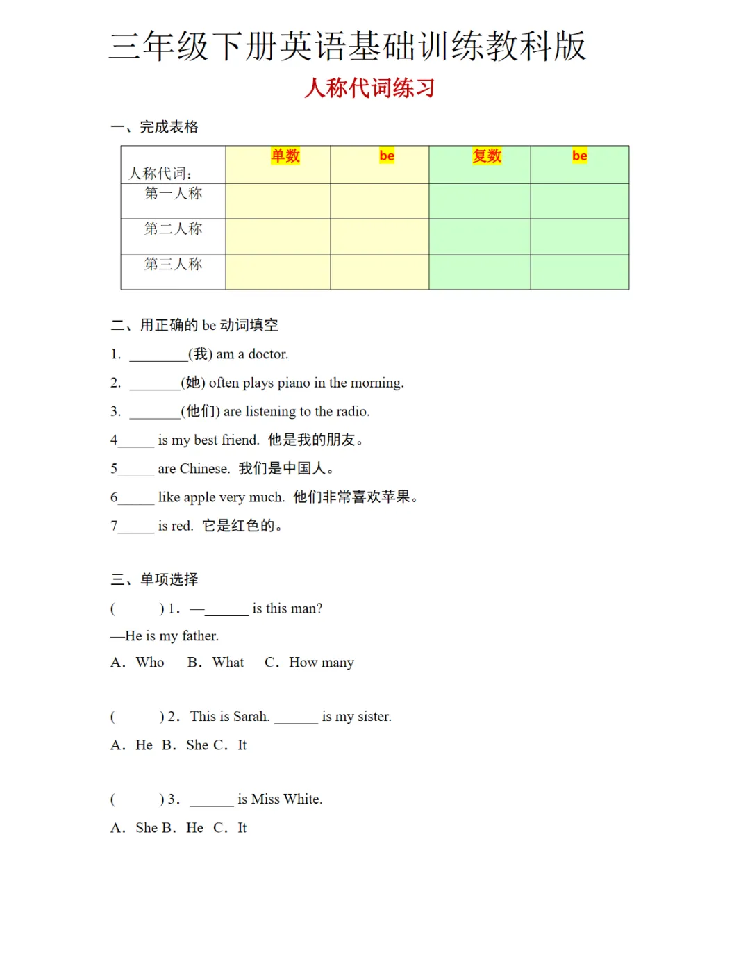 三年级(下)英语 人称代词(专项训练)《教科版》
