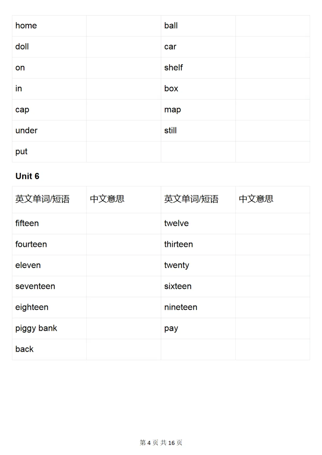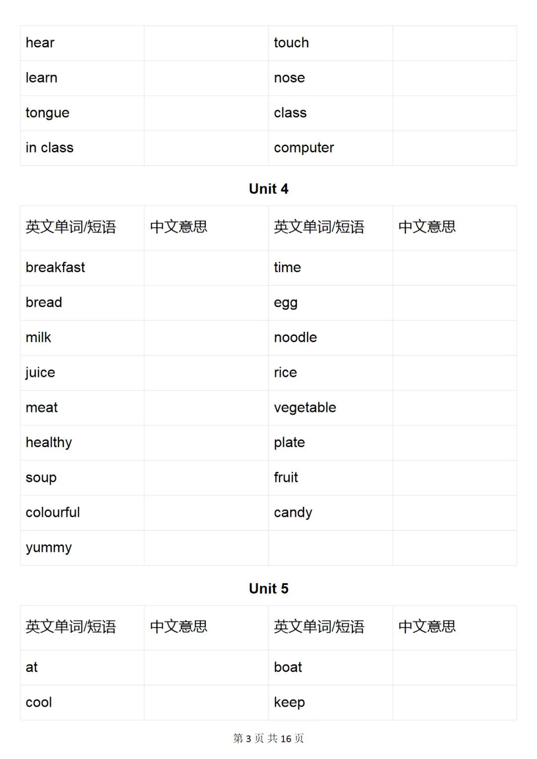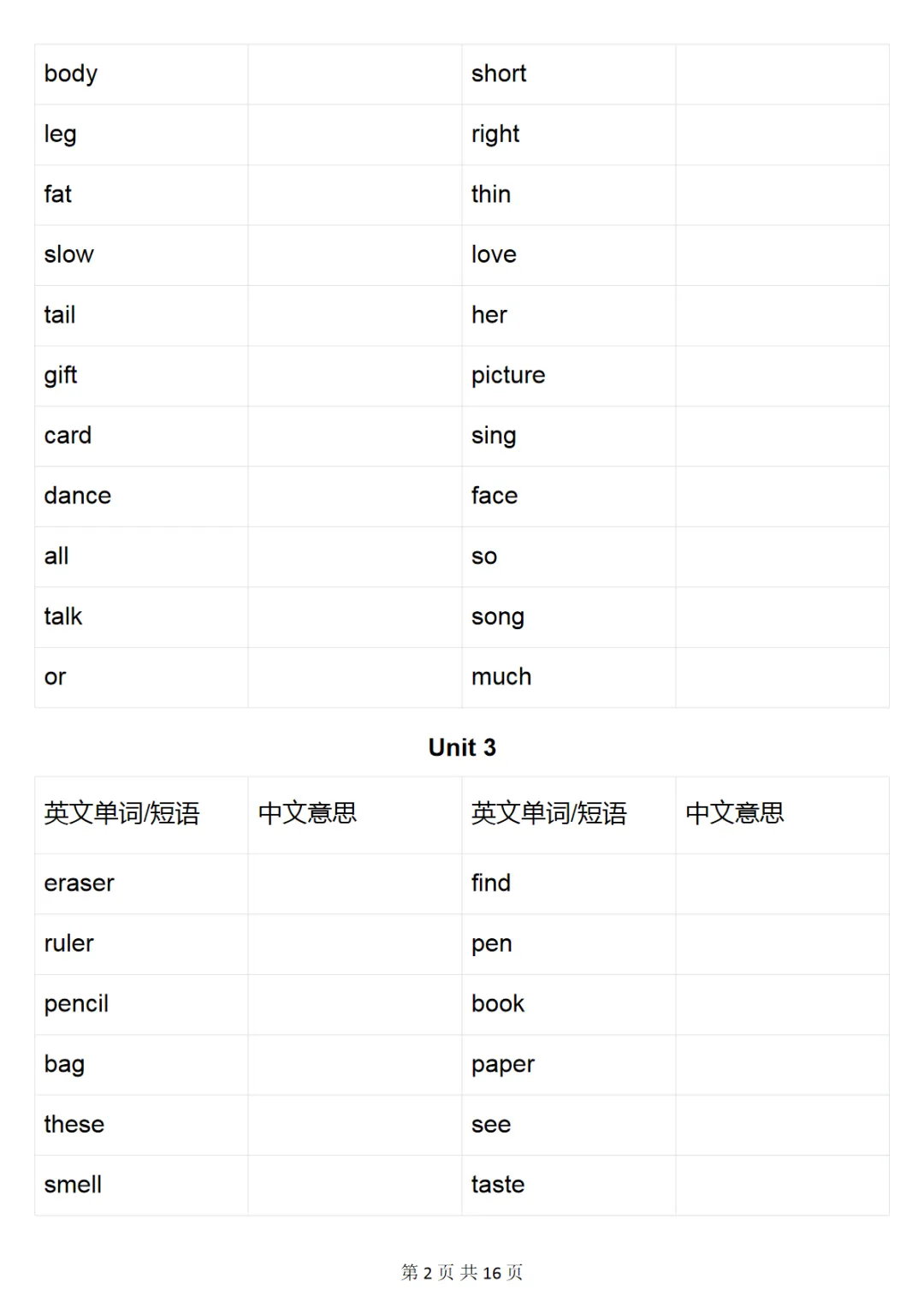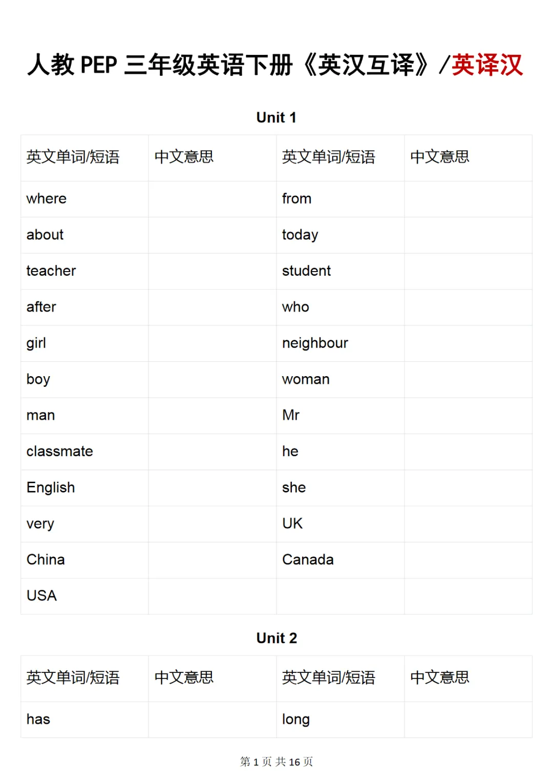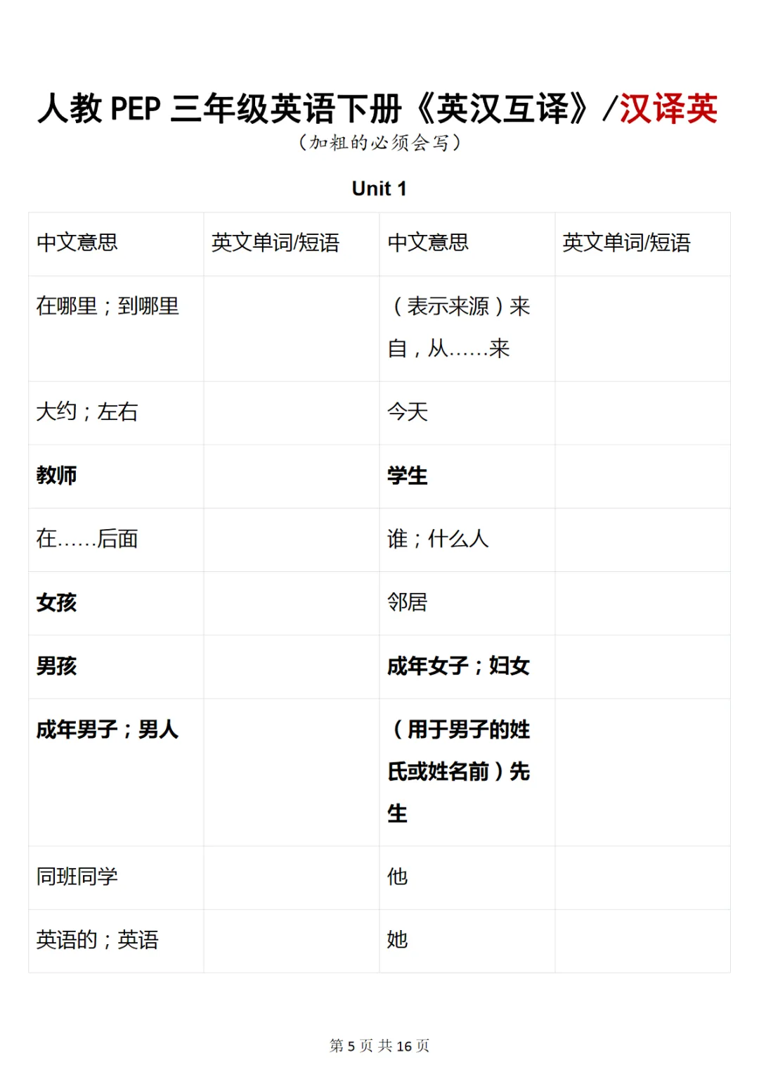 三年级(下)英语 英汉互译练习《人教版PEP》