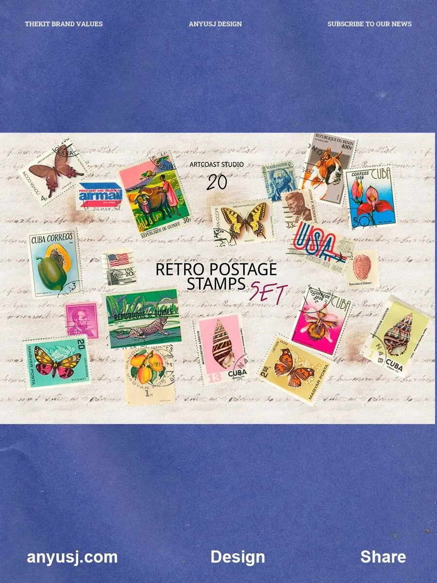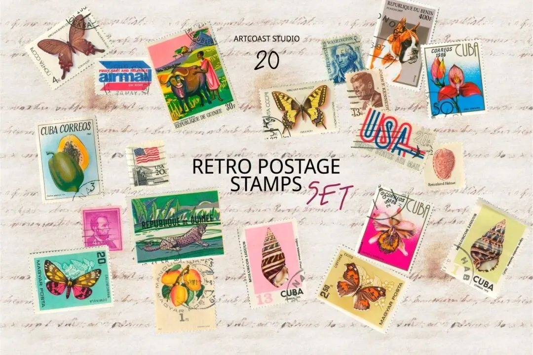 复古邮票收藏——20个裁切PNG文件 这是一套独特的20枚复古邮票收藏,精心剪裁并保存为高分辨率PNG格式,背景透明。每枚邮票来自不同国家,采用复古插图,如蝴蝶、贝壳、热带水果、花卉、历史肖像和经典邮寄设计。非常适合拼贴、剪贴簿、请柬、品牌塑造、复古海报、小品项目、数字艺术和创意文具设计。这套精心策划的套装为任何项目带来真实的魅力和怀旧质感。
