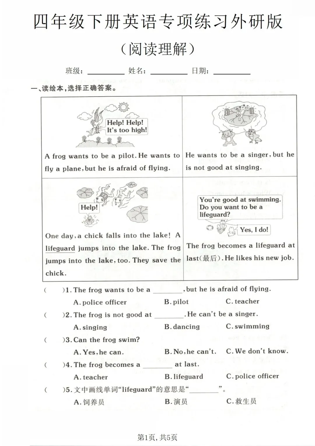 【免费下载】四年级(下)英语 阅读理解专项练习《外研版》,可打印