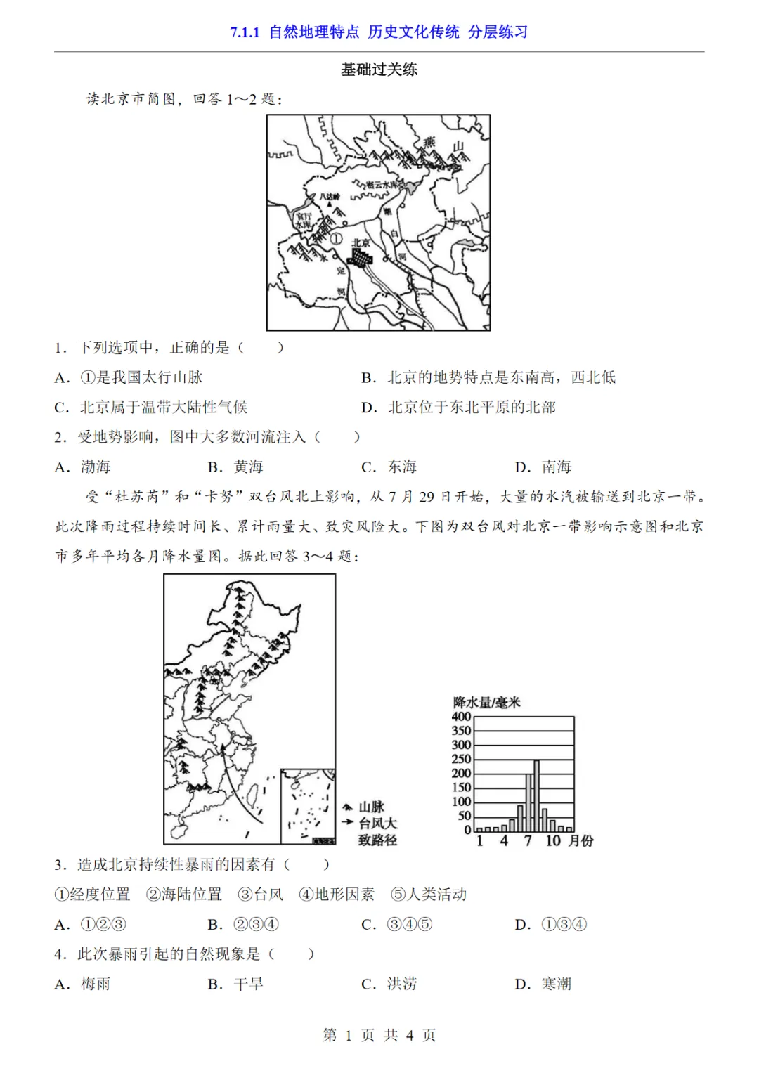 七年级(下)地理7.1.1自然地理特点 历史文化传统 分层练习(中图版)