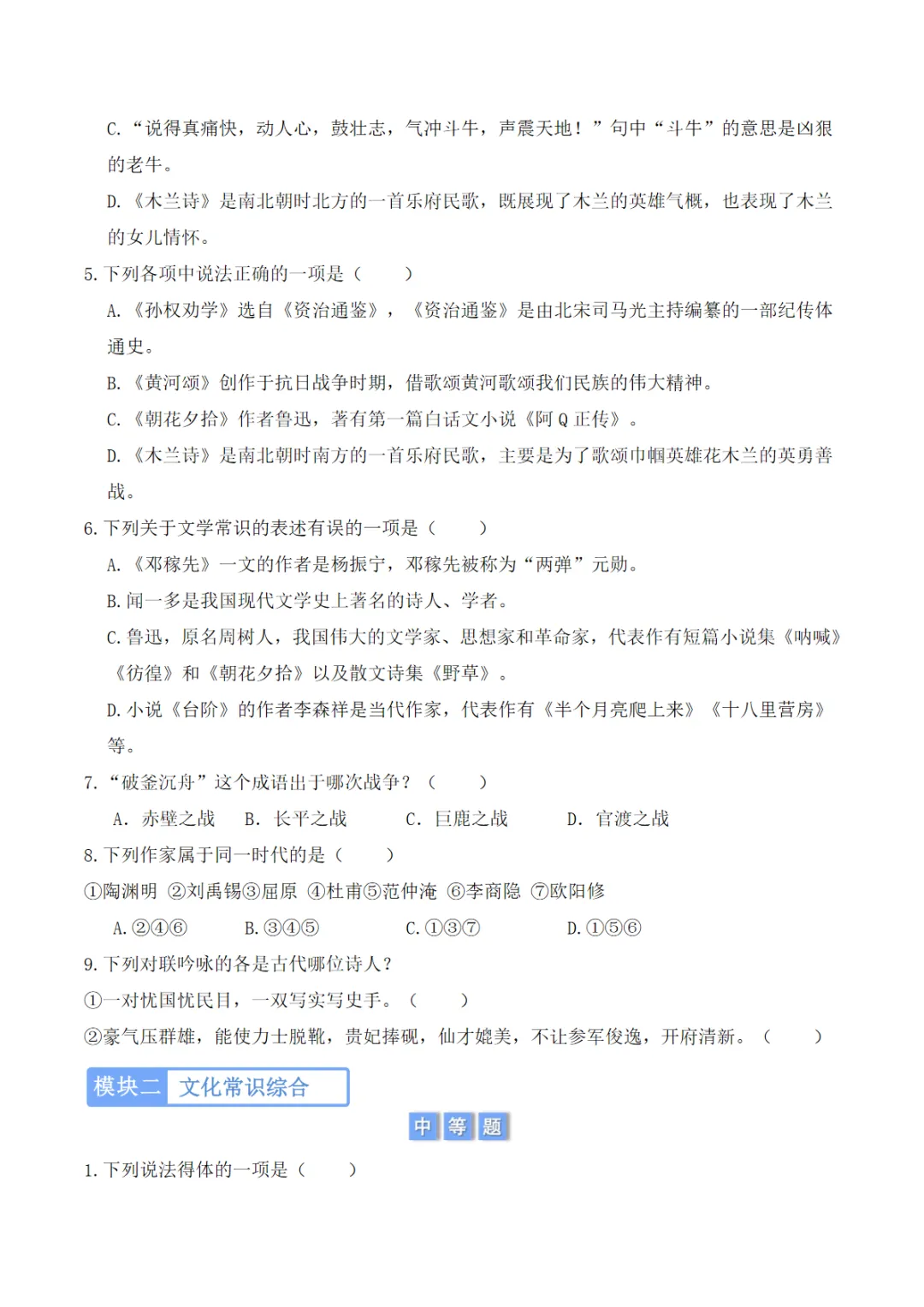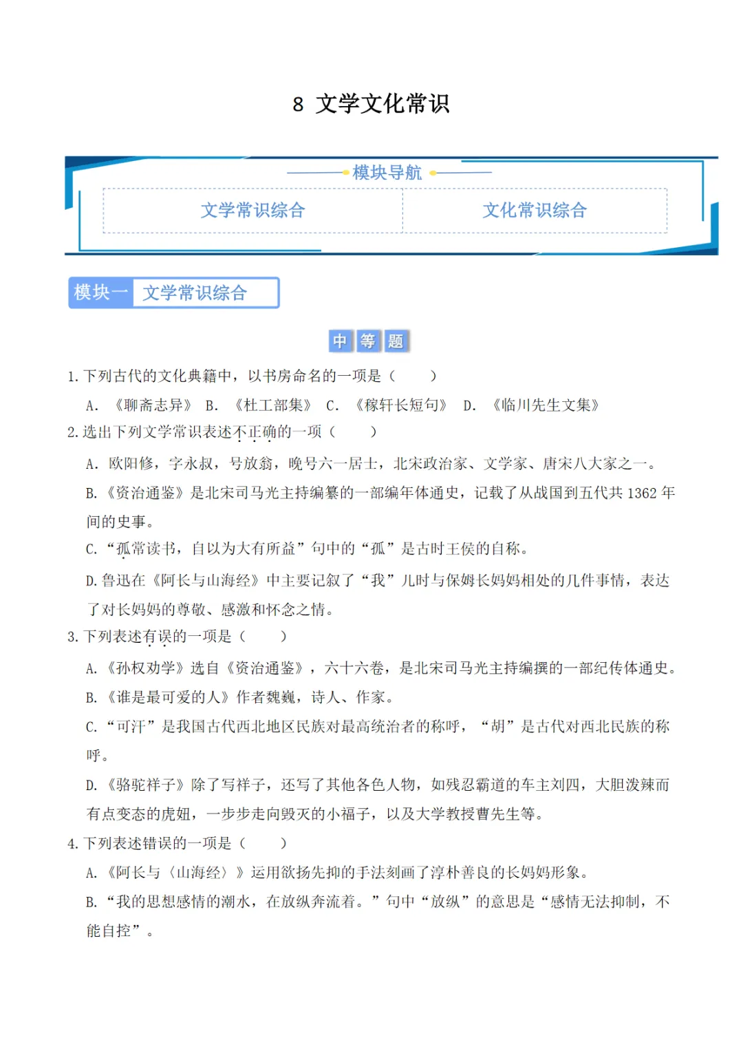 【免费下载】【七下语文】8 文学文化常识-统编版(2024)七年级下册期中专项(初中语文) (原卷版),可打印