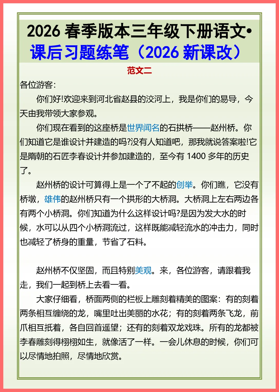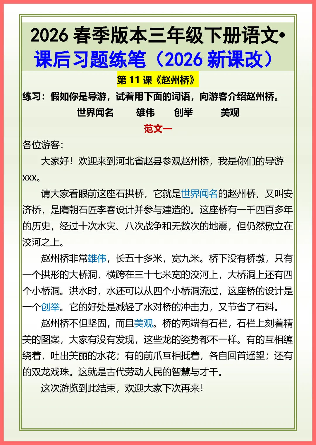 各位家长好!今天分享一份 2024 年部编版三年级下册语文《赵州桥》课后习题练笔,共 2 页精编资料。内容紧扣课文重点,涵盖词语积累、句式仿写及小练笔指导,旨在帮助孩子巩固课堂知识,提升阅读理解与写作表达能力。通过针对性练习,孩子能更深刻理解赵州桥的雄伟与智慧,轻松攻克单元难点。资料排版清晰,适合居家自测。需要的家长抓紧打印给孩子练一练吧,让孩子在练习中稳步进步!