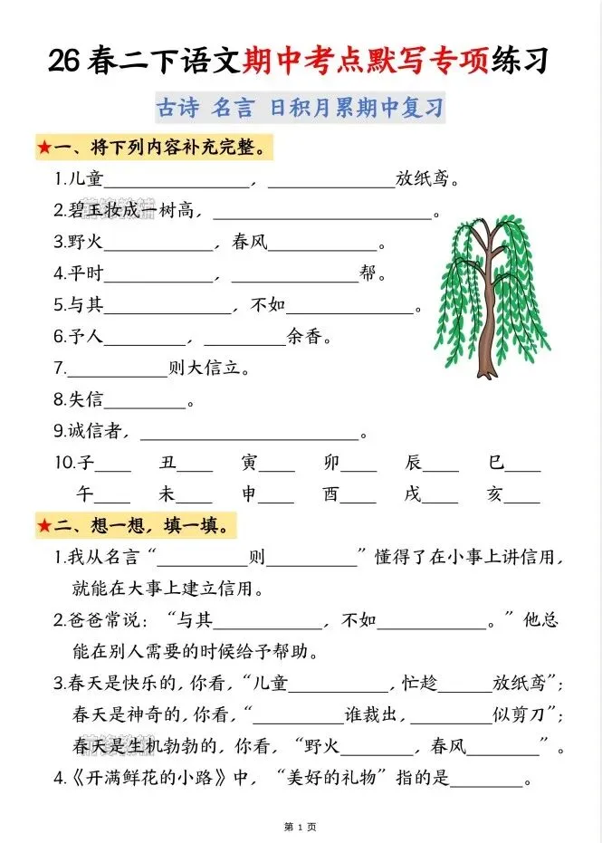 今天给大家整理了26春二年级下册语文期中考点默写专项练习(附答案),转发给朋友或班级群,受益更多人,帮助孩子学习!