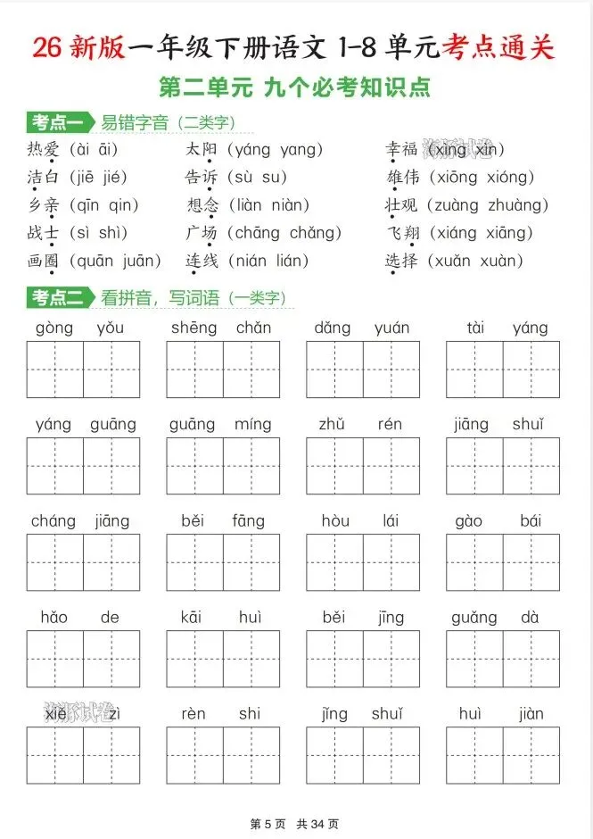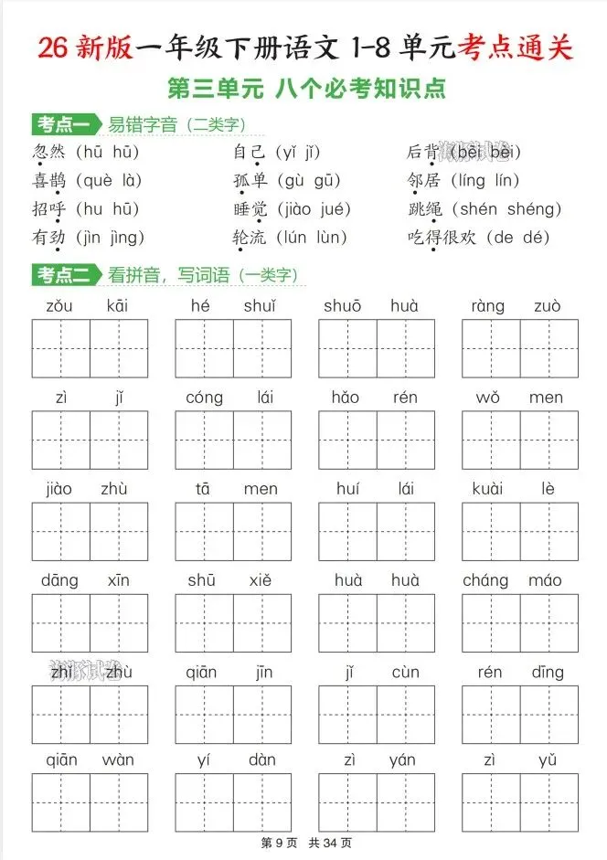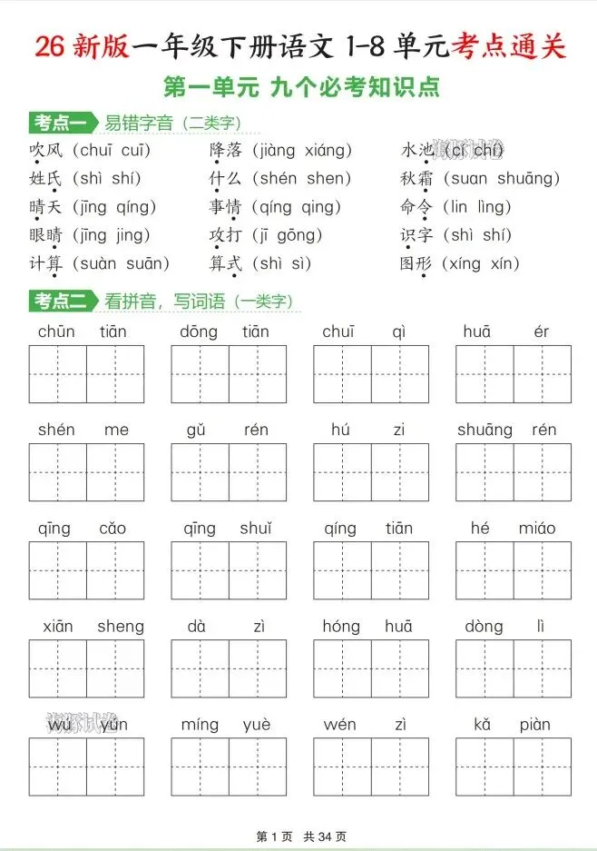 今天给大家整理了26春一年级语文下册1-8单元考点通关,转发给朋友或班级群,受益更多人,帮助孩子学习!