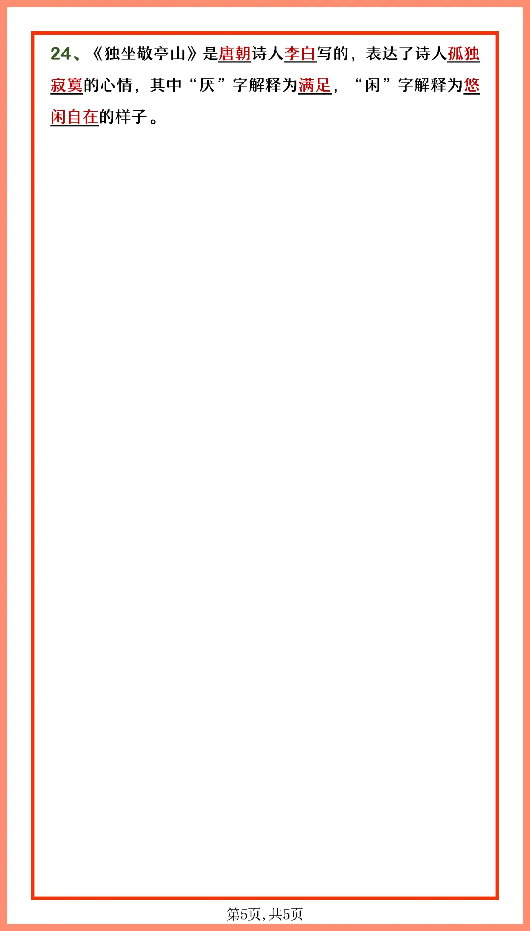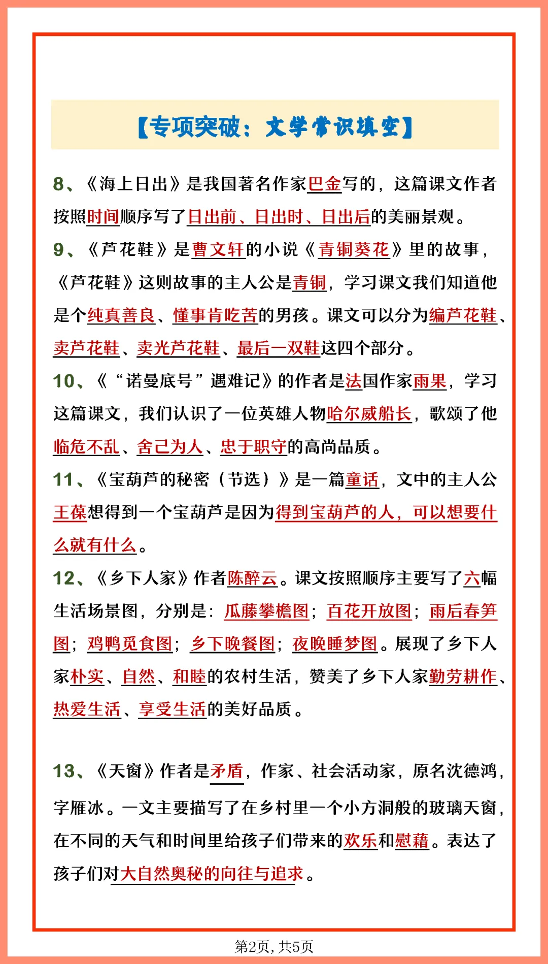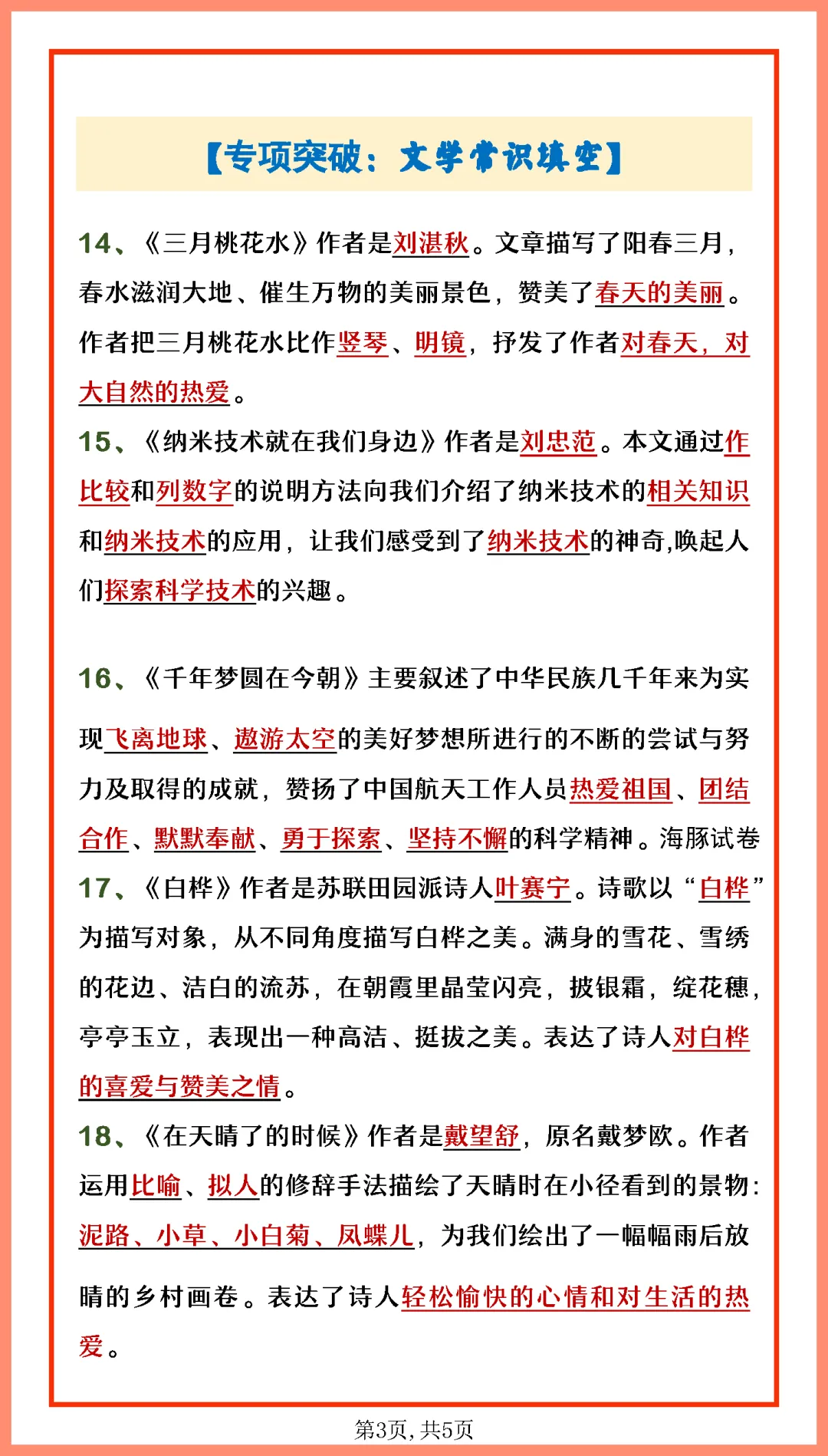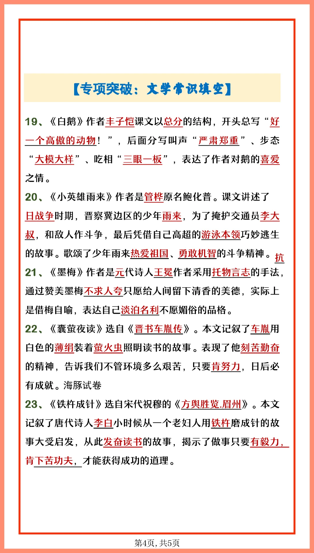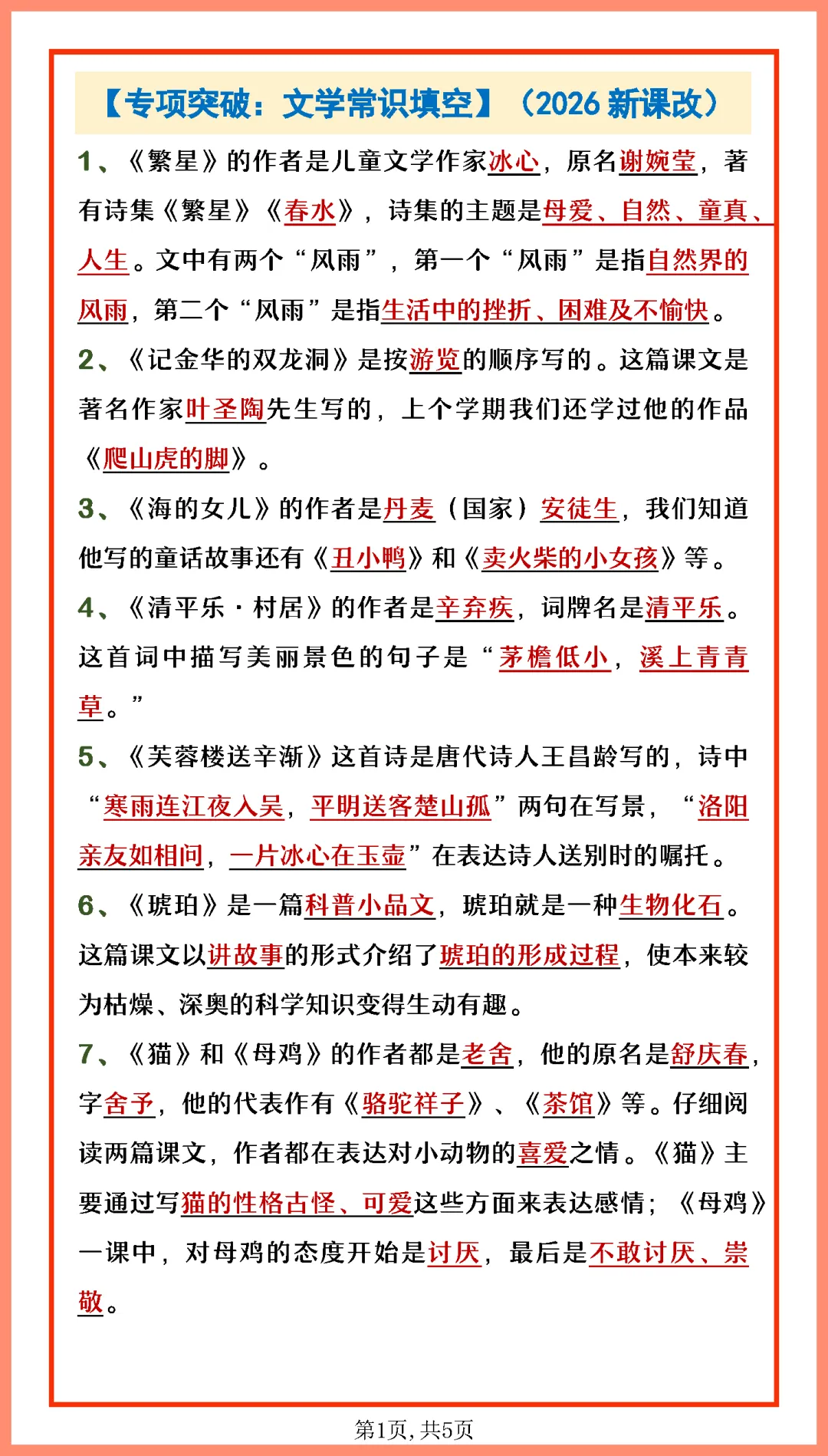 各位家长看过来!这份 2024 年最新版四年级下册语文《文学常识填空专项》来啦,共 5 页精华内容。资料紧扣教材考点,涵盖作家作品、古诗名句及文化常识,通过高频填空形式,帮孩子快速查漏补缺,夯实基础,轻松应对考试中的常识题。每天练一练,积累更扎实,做题不丢分!需要的家长赶紧收藏,抓紧打印给孩子练一练吧,让孩子在快乐中掌握知识,自信迎考!