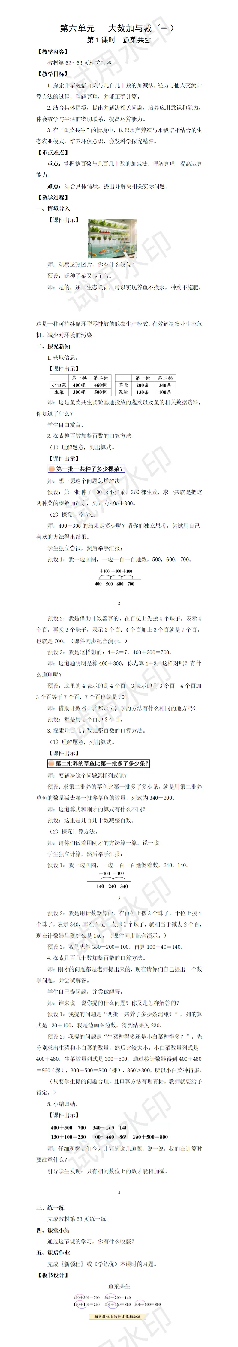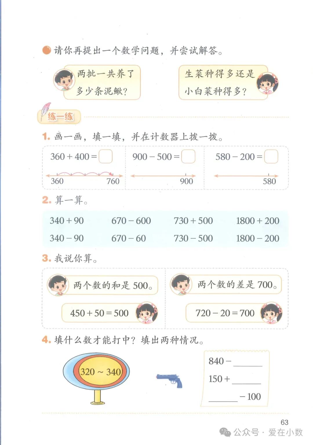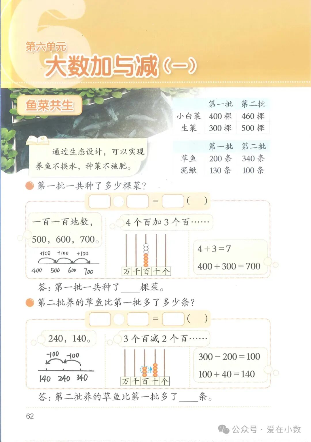本节课主要是学习几百几十数、整百数的加减法计算。我借助教材创设的“鱼菜共生”情境,先引出有关整百数加减整百数的问题,让学生尝试用自己喜欢的方法探索解决问题,大部分学生都能够借助已有的知识经验去解决问题,学生在互相交流的过程中体会到了算法的多样性以及不同方法之间的本质联系。在学生理解了整百数加减整百数的计算方法后,鼓励自主尝试解决新的问题,大部分学生都能主动地将刚学的知识迁移到新的问题当中,学习效果很不错。