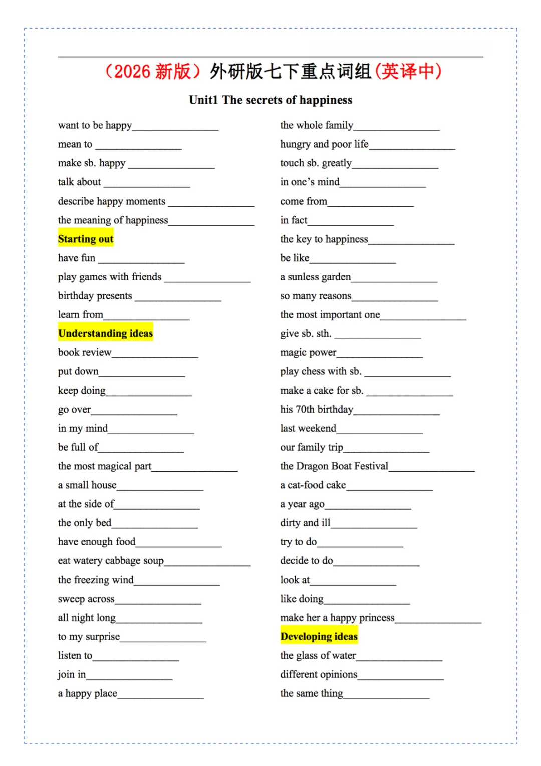 【免费下载】(2026)新版外研七下重点词组(英译中),可打印