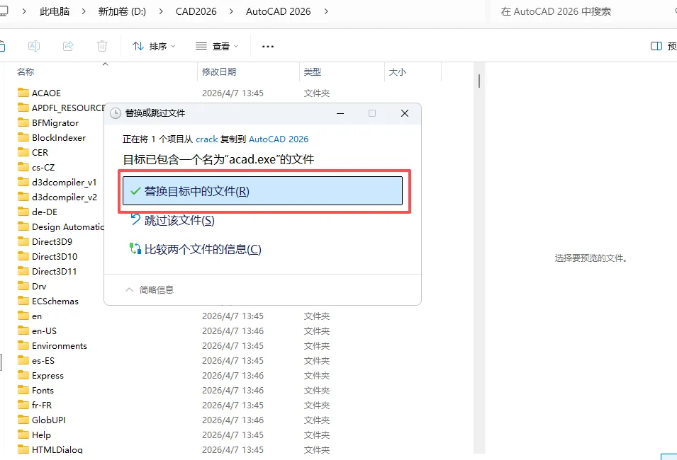 2.安装后,勾选【我同意使用条款】,点击【下一步】。5.打开解压后的【Crack】文件夹,复制【acad】文件。6.鼠标右击桌面【AutoCAD 2026】图标选择【打开文件所在的位置】。并粘贴复制的文件,选择替换7.双击击桌面CAD 2026图标启动软件,安装成功。
