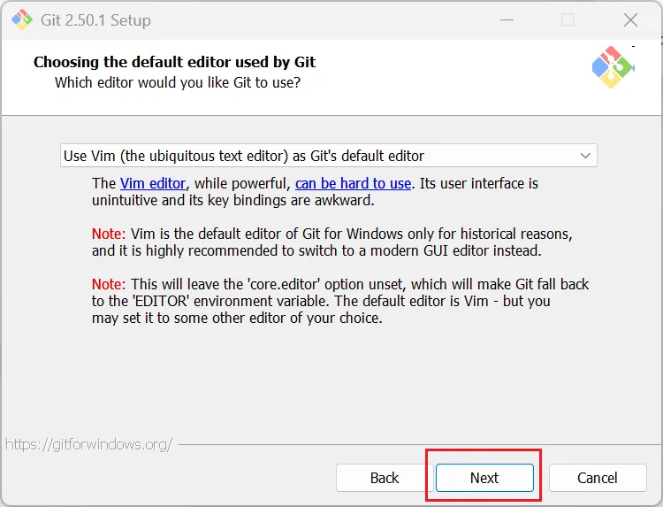 Git的默认编辑器为Vim,部分不熟悉Vim使用的,可以点击选择现代的GUI编辑器,如Notepad++等,无需修改点击进行下一步