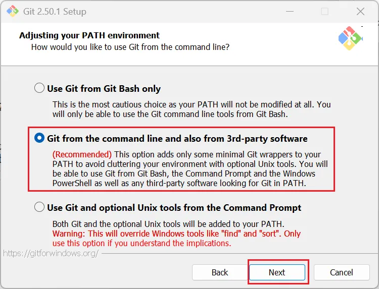 第三个是“从命令提示符使用Git和可选的Unix工具”。警告:这将覆盖Windows工具,如“find 和sort ”。只有在了解其含义后才使用此选项。